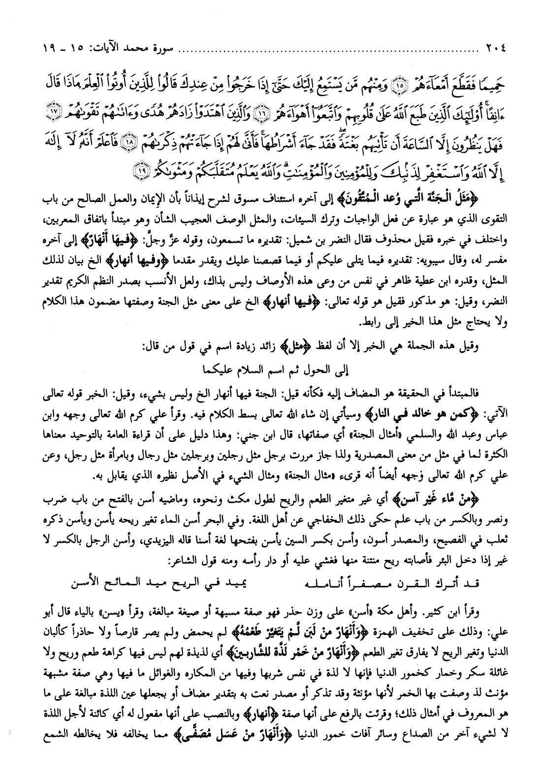 مِنْ ماءٍ غَيْرِ آسِنٍ أي غير متغير الطعم والريح لطول مكث ونحوه، وماضيه أسن بالفتح من باب ضرب ونصر وبالكسر من باب علم حكى ذلك الخفاجي عن أهل اللغة. وفي البحر أسن الماء تغير ريحه يأسن ويأسن ذكره ثعلب في الفصيح، والمصدر أسون، وأسن بكسر السين يأسن بفتحها لغة أسنا قاله اليزيدي، وأسن الرجل بالكسر لا غير إذا دخل البئر فأصابته ريح منتنة منها فغشي عليه أو دار رأسه ومنه قول الشاعر: