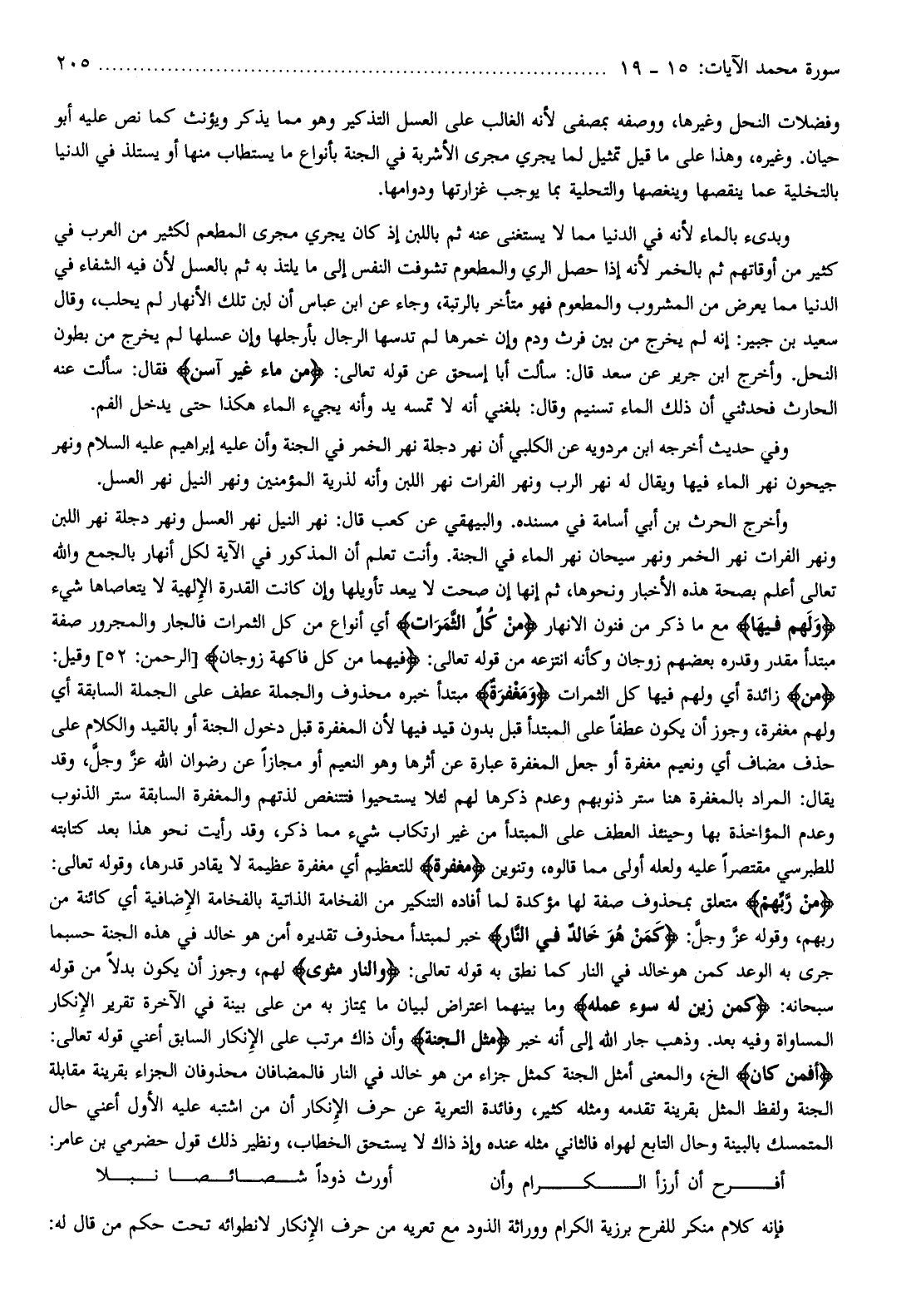 وبدىء بالماء لأنه في الدنيا مما لا يستغنى عنه ثم باللبن إذ كان يجري مجرى المطعم لكثير من العرب في كثير من أوقاتهم ثم بالخمر لأنه إذا حصل الري والمطعوم تشوفت النفس إلى ما يلتذ به ثم بالعسل لأن فيه الشفاء في الدنيا مما يعرض من المشروب والمطعوم فهو متأخر بالرتبة، وجاء عن ابن عباس أن لبن تلك الأنهار لم يحلب، وقال سعيد بن جبير: إنه لم يخرج من بين فرث ودم وإن خمرها لم تدسها الرجال بأرجلها وإن عسلها لم يخرج من بطون النحل. وأخرج ابن جرير عن سعد قال: سألت أبا إسحق عن قوله تعالى: مِنْ ماءٍ غَيْرِ آسِنٍ فقال: سألت عنه الحارث فحدثني أن ذلك الماء تسنيم وقال: بلغني أنه لا تمسه يد وأنه يجيء الماء هكذا حتى يدخل الفم.