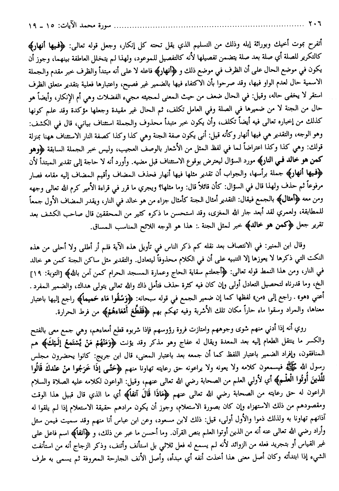 روي أنه إذا أدني منهم شوى وجوههم وامتازت فروة رؤوسهم فإذا شربوه قطع أمعاءهم، وهي جمع معى بالفتح والكسر ما ينتقل الطعام إليه بعد المعدة ويقال له عفاج وهو مذكر وقد يؤنث وَمِنْهُمْ مَنْ يَسْتَمِعُ إِلَيْكَ هم المنافقون، وإفراد الضمير باعتبار اللفظ كما أن جمعه بعد باعتبار المعنى، قال ابن جريج: كانوا يحضرون مجلس رسول الله صلّى الله عليه وسلّم فيسمعون كلامه ولا يعونه ولا يراعونه حق رعايته تهاونا منهم حَتَّى إِذا خَرَجُوا مِنْ عِنْدِكَ قالُوا لِلَّذِينَ أُوتُوا الْعِلْمَ أي لأولي العلم من الصحابة رضي الله تعالى عنهم، وقيل: الواعون لكلامه عليه الصلاة والسلام الراعون له حق رعايته من الصحابة رضي الله تعالى عنهم ماذا قالَ آنِفاً أي ما الذي قال قبيل هذا الوقت ومقصودهم من ذلك الاستهزاء وإن كان بصورة الاستعلام، وجوز أن يكون مرادهم حقيقة الاستعلام إذا لم يلقوا له آذانهم تهاونا به ولذلك ذموا والأول أولى، قيل: ذلك لابن مسعود، وعن ابن عباس أنا منهم وقد سميت فيمن سئل وأراد رضي الله تعالى عنه أنه من الذين أوتوا العلم بنص القرآن. وما أحسن ما عبر عن ذلك، وآنِفاً اسم فاعل على غير القياس أو بتجريد فعله من الزوائد لأنه لم يسمع له فعل ثلاثي بل استأنف وأتنف، وذكر الزجاج أنه من استأنفت الشيء إذا ابتدأته وكان أصل معنى هذا أخذت أنفه أي مبدأه، وأصل الأنف الجارحة المعروفة ثم يسمى به طرف