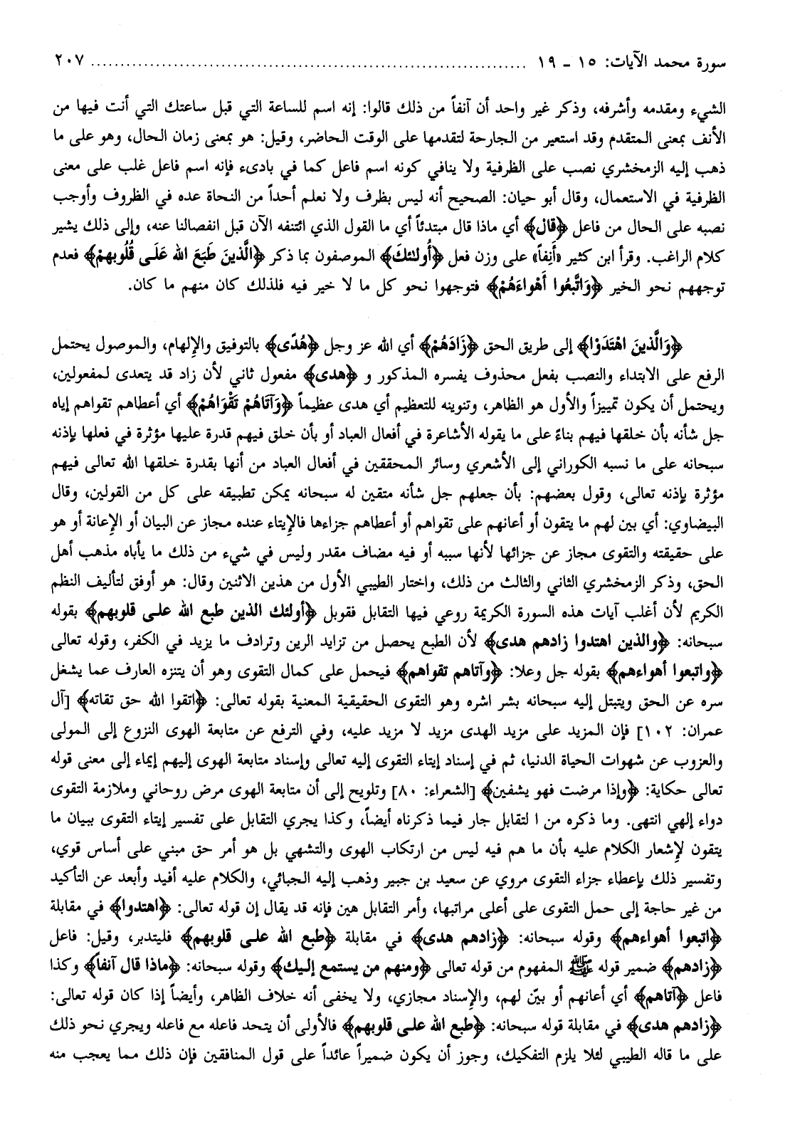 وَالَّذِينَ اهْتَدَوْا إلى طريق الحق زادَهُمْ أي الله عز وجل هُدىً بالتوفيق والإلهام، والموصول يحتمل الرفع على الابتداء والنصب بفعل محذوف يفسره المذكور وهُدىً مفعول ثاني لأن زاد قد يتعدى لمفعولين، ويحتمل أن يكون تمييزا والأول هو الظاهر، وتنوينه للتعظيم أي هدى عظيما وَآتاهُمْ تَقْواهُمْ أي أعطاهم تقواهم إياه جل شأنه بأن خلقها فيهم بناء على ما يقوله الأشاعرة في أفعال العباد أو بأن خلق فيهم قدرة عليها مؤثرة في فعلها بإذنه سبحانه على ما نسبه الكوراني إلى الأشعري وسائر المحققين في أفعال العباد من أنها بقدرة خلقها الله تعالى فيهم مؤثرة بإذنه تعالى، وقول بعضهم: بأن جعلهم جل شأنه متقين له سبحانه يمكن تطبيقه على كل من القولين، وقال البيضاوي: أي بين لهم ما يتقون أو أعانهم على تقواهم أو أعطاهم جزاءها فالإيتاء عنده مجاز عن البيان أو الإعانة أو هو على حقيقته والتقوى مجاز عن جزائها لأنها سببه أو فيه مضاف مقدر وليس في شيء من ذلك ما يأباه مذهب أهل الحق، وذكر الزمخشري الثاني والثالث من ذلك، واختار الطيبي الأول من هذين الاثنين وقال: هو أوفق لتأليف النظم الكريم لأن أغلب آيات هذه السورة الكريمة روعي فيها التقابل فقوبل أُولئِكَ الَّذِينَ طَبَعَ اللَّهُ عَلى قُلُوبِهِمْ بقوله سبحانه: وَالَّذِينَ اهْتَدَوْا زادَهُمْ هُدىً لأن الطبع يحصل من تزايد الرين وترادف ما يزيد في الكفر، وقوله تعالى وَاتَّبَعُوا أَهْواءَهُمْ بقوله جل وعلا: وَآتاهُمْ تَقْواهُمْ فيحمل على كمال التقوى وهو أن يتنزه العارف عما يشغل سره عن الحق ويتبتل إليه سبحانه بشر أشره وهو التقوى الحقيقية المعنية بقوله تعالى: اتَّقُوا اللَّهَ حَقَّ تُقاتِهِ [آل عمران: 102] فإن المزيد على مزيد الهدى مزيد لا مزيد عليه، وفي الترفع عن متابعة الهوى النزوع إلى المولى والعزوب عن شهوات الحياة الدنيا، ثم في إسناد إيتاء التقوى إليه تعالى وإسناد متابعة الهوى إليهم إيماء إلى معنى قوله تعالى حكاية: وَإِذا مَرِضْتُ فَهُوَ يَشْفِينِ [الشعراء: 80] وتلويح إلى أن متابعة الهوى مرض روحاني وملازمة التقوى دواء إلهي انتهى. وما ذكره من التقابل جار فيما ذكرناه أيضا، وكذا يجري التقابل على تفسير إيتاء التقوى ببيان ما يتقون لإشعار الكلام عليه بأن ما هم فيه ليس من ارتكاب الهوى والتشهي بل هو أمر حق مبني على أساس قوي، وتفسير ذلك بإعطاء جزاء التقوى مروي عن سعيد بن جبير وذهب إليه الجبائي، والكلام عليه أفيد وأبعد عن التأكيد من غير حاجة إلى حمل التقوى على أعلى مراتبها، وأمر التقابل هين فإنه قد يقال إن قوله تعالى: اهْتَدَوْا في مقابلة اتَّبَعُوا أَهْواءَهُمْ وقوله سبحانه: زادَهُمْ هُدىً في مقابلة طَبَعَ اللَّهُ عَلى قُلُوبِهِمْ فليتدبر، وقيل: فاعل زادَهُمْ ضمير قوله صلّى الله عليه وسلّم المفهوم من قوله تعالى وَمِنْهُمْ مَنْ يَسْتَمِعُ إِلَيْكَ وقوله سبحانه: ماذا قالَ آنِفاً وكذا فاعل آتاهُمْ أي أعانهم أو بيّن لهم، والإسناد مجازي، ولا يخفى أنه خلاف الظاهر، وأيضا إذا كان قوله تعالى: