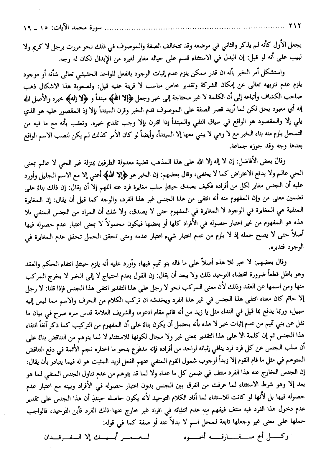 إن الجنس الخارج عنه هذا الفرد منتف في ضمن كل ما عداه ولا لما قد يتوهم من عدم تناول الجنس المنفي لما هو بعد إلا وهو شرط الاستثناء لما عرفت من الفرق بين الجنس بدون اعتبار حصوله في الأفراد وبينه مع اعتبار عدم حصوله فيها بل لأنها لو كانت للاستثناء لما أفاد الكلام التوحيد لأنه يكون حاصله حينئذ أن هذا الجنس على تقدير عدم دخول هذا الفرد فيه منتف فيفهم منه عدم انتفائه في افراد غير خارج عنها ذلك الفرد فأين التوحيد، فالواجب حملها على معنى غير وجعلها تابعة لمحل اسم لا بدلا عنه أو صفة كما في قوله: