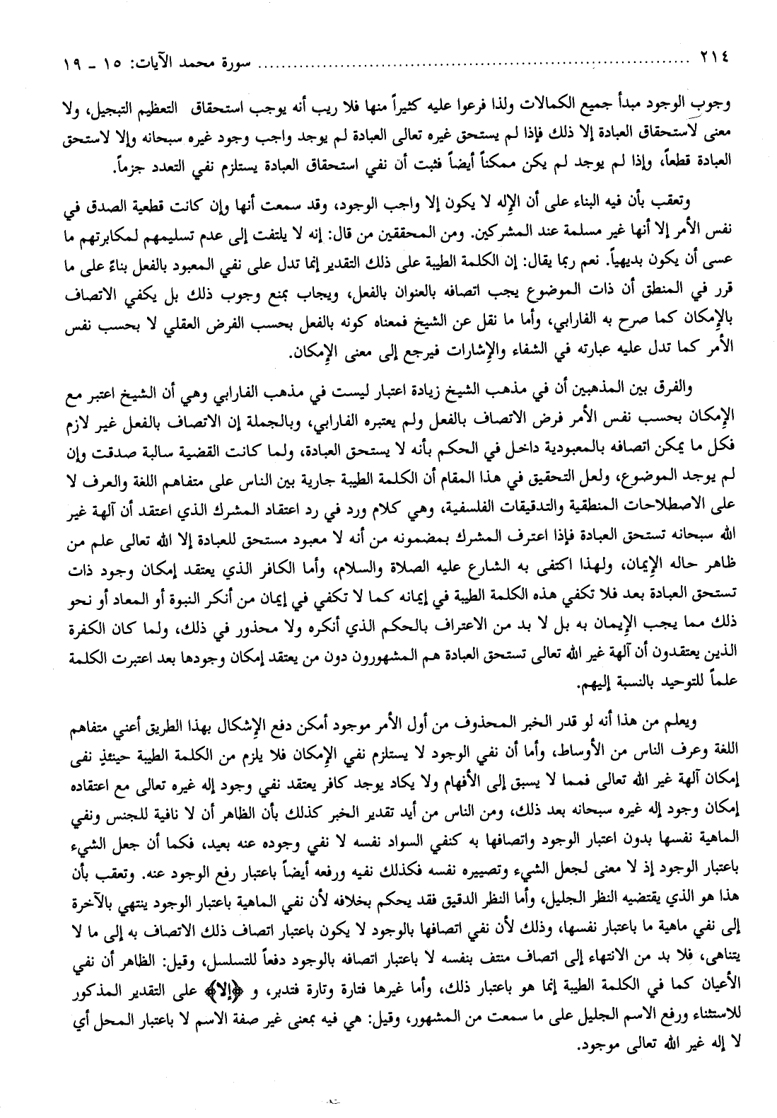 والفرق بين المذهبين أن في مذهب الشيخ زيادة اعتبار ليست في مذهب الفارابي وهي أن الشيخ اعتبر مع الإمكان بحسب نفس الأمر فرض الاتصاف بالفعل ولم يعتبره الفارابي، وبالجملة إن الاتصاف بالفعل غير لازم فكل ما يمكن اتصافه بالمعبودية داخل في الحكم بأنه لا يستحق العبادة، ولما كانت القضية سالبة صدقت وإن لم يوجد الموضوع، ولعل التحقيق في هذا المقام أن الكلمة الطيبة جارية بين الناس على متفاهم اللغة والعرف لا على الاصطلاحات المنطقية والتدقيقات الفلسفية، وهي كلام ورد في رد اعتقاد المشرك الذي اعتقد أن آلهة غير الله سبحانه تستحق العبادة فإذا اعترف المشرك بمضمونه من أنه لا معبود مستحق للعبادة إلا الله تعالى علم من ظاهر حاله الإيمان، ولهذا اكتفى به الشارع عليه الصلاة والسلام، وأما الكافر الذي يعتقد إمكان وجود ذات تستحق العبادة بعد فلا تكفي هذه الكلمة الطيبة في إيمانه كما لا تكفي في إيمان من أنكر النبوة أو المعاد أو نحو ذلك مما يجب الإيمان به بل لا بد من الاعتراف بالحكم الذي أنكره ولا محذور في ذلك، ولما كان الكفرة الذين يعتقدون أن آلهة غير الله تعالى تستحق العبادة هم المشهورون دون من يعتقد إمكان وجودها بعد اعتبرت الكلمة علما للتوحيد بالنسبة إليهم.