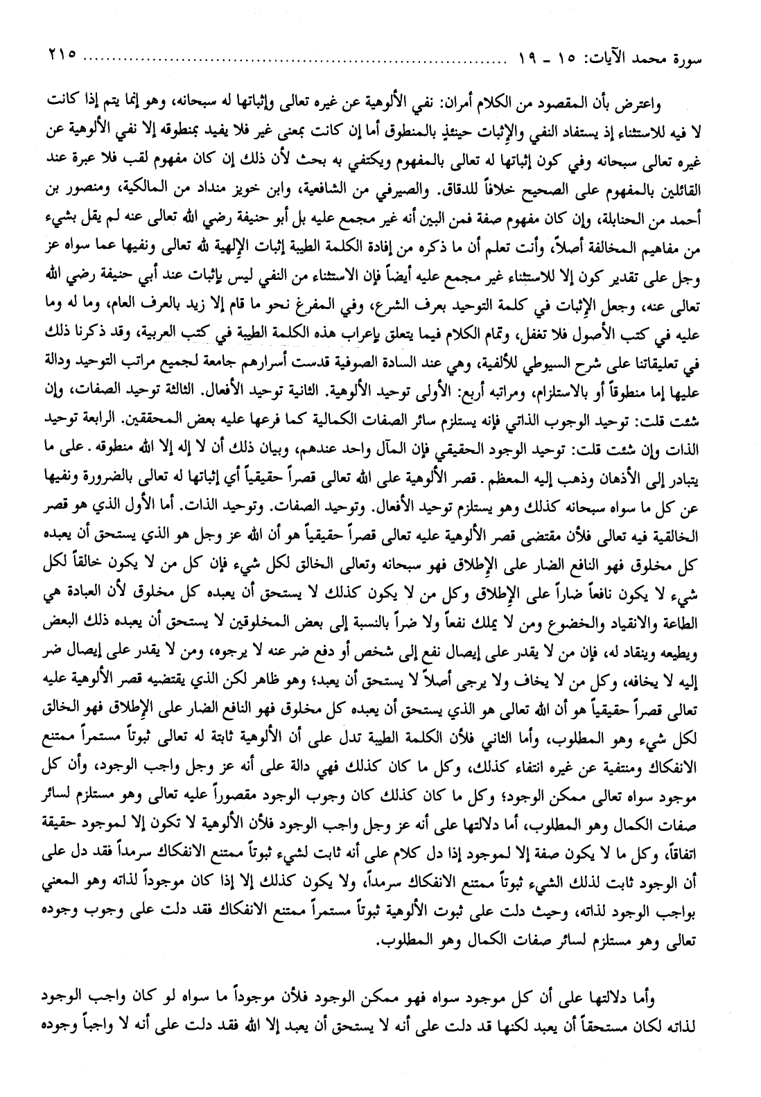 واعترض بأن المقصود من الكلام أمران: نفي الألوهية عن غيره تعالى وإثباتها له سبحانه، وهو إنما يتم إذا كانت لا فيه للاستثناء إذ يستفاد النفي والإثبات حينئذ بالمنطوق أما إن كانت بمعنى غير فلا يفيد بمنطوقه إلا نفي الألوهية عن غيره تعالى سبحانه وفي كون إثباتها له تعالى بالمفهوم ويكتفي به بحث لأن ذلك إن كان مفهوم لقب فلا عبرة عند القائلين بالمفهوم على الصحيح خلافا للدقاق. والصيرفي من الشافعية، وابن خويز منداد من المالكية، ومنصور بن أحمد من الحنابلة، وإن كان مفهوم صفة فمن البين أنه غير مجمع عليه بل أبو حنيفة رضي الله تعالى عنه لم يقل بشيء من مفاهيم المخالفة أصلا، وأنت تعلم أن ما ذكره من إفادة الكلمة الطيبة إثبات الإلهية لله تعالى ونفيها عما سواه عز وجل على تقدير كون إلا للاستثناء غير مجمع عليه أيضا فإن الاستثناء من النفي ليس بإثبات عند أبي حنيفة رضي الله تعالى عنه، وجعل الإثبات في كلمة التوحيد بعرف الشرع، وفي المفرغ نحو ما قام إلا زيد بالعرف العام، وما له وما عليه في كتب الأصول فلا تغفل، وتمام الكلام فيما يتعلق بإعراب هذه الكلمة الطيبة في كتب العربية، وقد ذكرنا ذلك في تعليقاتنا على شرح السيوطي للألفية، وهي عند السادة الصوفية قدست أسرارهم جامعة لجميع مراتب التوحيد ودالة عليها إما منطوقا أو بالاستلزام، ومراتبه أربع: الأولى توحيد الألوهية. الثانية توحيد الأفعال. الثالثة توحيد الصفات، وإن شئت قلت: توحيد الوجوب الذاتي فإنه يستلزم سائر الصفات الكمالية كما فرعها عليه بعض المحققين. الرابعة توحيد الذات وإن شئت قلت: توحيد الوجود الحقيقي فإن المآل واحد عندهم، وبيان ذلك أن لا إله إلا الله منطوقه. على ما يتبادر إلى الأذهان وذهب إليه المعظم. قصر الألوهية على الله تعالى قصرا حقيقيا أي إثباتها له تعالى بالضرورة ونفيها عن كل ما سواه سبحانه كذلك وهو يستلزم توحيد الأفعال. وتوحيد الصفات. وتوحيد الذات. أما الأول الذي هو قصر الخالقية فيه تعالى فلأن مقتضى قصر الألوهية عليه تعالى قصرا حقيقيا هو أن الله عز وجل هو الذي يستحق أن يعبده كل مخلوق فهو النافع الضار على الإطلاق فهو سبحانه وتعالى الخالق لكل شيء فإن كل من لا يكون خالقا لكل شيء لا يكون نافعا ضارا على الإطلاق وكل من لا يكون كذلك لا يستحق أن يعبده كل مخلوق لأن العبادة هي الطاعة والانقياد والخضوع ومن لا يملك نفعا ولا ضرا بالنسبة إلى بعض المخلوقين لا يستحق أن يعبده ذلك البعض ويطيعه وينقاد له، فإن من لا يقدر على إيصال نفع إلى شخص أو دفع ضر عنه لا يرجوه، ومن لا يقدر على إيصال ضر إليه لا يخافه، وكل من لا يخاف ولا يرجى أصلا لا يستحق أن يعبد وهو ظاهر لكن الذي