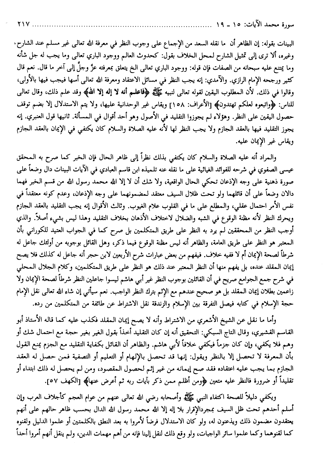 البينات بقوله: إن الظاهر أن ما نقله السعد من الإجماع على وجوب النظر في معرفة الله تعالى غير مسلم عند الشارح وغيره، ألا ترى إلى تمثيل الشارح لمحل الخلاف بقول: كحدوث العالم ووجود الباري تعالى وما يجب له جل شأنه وما يمتنع عليه سبحانه من الصفات فإن قوله: ووجود الباري تعالى إلخ يتعلق بمعرفته عزّ وجلّ إلى آخر ما قال. نعم قال كثير ورجحه الإمام الرازي. والآمدي: إنه يجب النظر في مسائل الاعتقاد ومعرفة الله تعالى أسها فيجب فيها بالأولى، وقالوا في ذلك. لأن المطلوب اليقين لقوله تعالى لنبيه صلّى الله عليه وسلّم فَاعْلَمْ أَنَّهُ لا إِلهَ إِلَّا اللَّهُ وقد علم ذلك، وقال تعالى للناس: وَاتَّبِعُوهُ لَعَلَّكُمْ تَهْتَدُونَ [الأعراف: 158] ويقاس غير الوحدانية عليها، ولا يتم الاستدلال إلا بضم توقف حصول اليقين على النظر. وهؤلاء لم يجوزوا التقليد في الأصول وهو أحد أقوال في المسألة. ثانيها قول العنبري. إنه يجوز التقليد فيها بالعقد الجازم ولا يجب النظر لها لأنه عليه الصلاة والسلام كان يكتفي في الإيمان بالعقد الجازم ويقاس غير الإيمان عليه.
