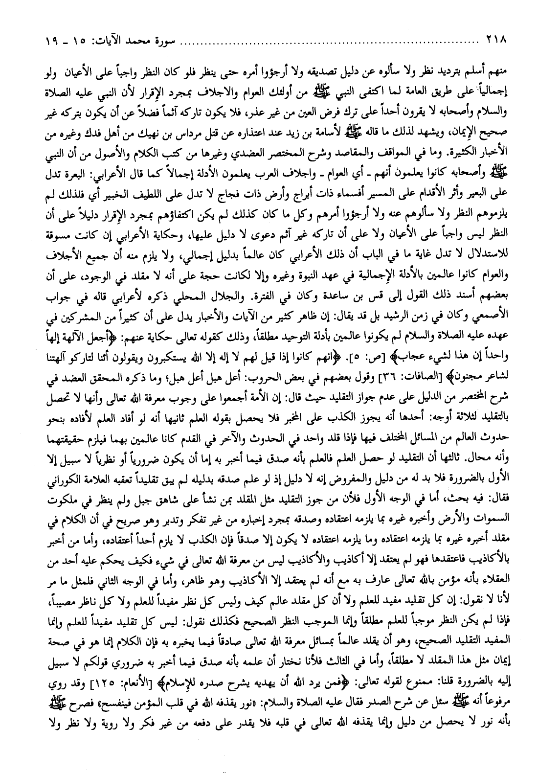منهم أسلم بترديد نظر ولا سألوه عن دليل تصديقه ولا أرجؤوا أمره حتى ينظر فلو كان النظر واجبا على الأعيان ولو إجماليا على طريق العامة لما اكتفى النبي صلّى الله عليه وسلّم من أولئك العوام والأجلاف بمجرد الإقرار لأن النبي عليه الصلاة والسلام وأصحابه لا يقرون أحدا على ترك فرض العين من غير عذر، فلا يكون تاركه آثما فضلا عن أن يكون بتركه غير صحيح الإيمان، ويشهد لذلك ما قاله صلّى الله عليه وسلّم لأسامة بن زيد عند اعتذاره عن قتل مرداس بن نهيك من أهل فدك وغيره من الأخبار الكثيرة. وما في المواقف والمقاصد وشرح المختصر العضدي وغيرها من كتب الكلام والأصول من أن النبي صلّى الله عليه وسلّم وأصحابه كانوا يعلمون أنهم- أي العوام- واجلاف العرب يعلمون الأدلة إجمالا كما قال الأعرابي: البعرة تدل على البعير وأثر الأقدام على المسير أفسماء ذات أبراج وأرض ذات فجاج لا تدل على اللطيف الخبير أي فلذلك لم يلزموهم النظر ولا سألوهم عنه ولا أرجؤوا أمرهم وكل ما كان كذلك لم يكن اكتفاؤهم بمجرد الإقرار دليلا على أن النظر ليس واجبا على الأعيان ولا على أن تاركه غير آثم دعوى لا دليل عليها، وحكاية الأعرابي إن كانت مسوقة للاستدلال لا تدل غاية ما في الباب أن ذلك الأعرابي كان عالما بدليل إجمالي، ولا يلزم منه أن جميع الأجلاف والعوام كانوا عالمين بالأدلة الإجمالية في عهد النبوة وغيره وإلا لكانت حجة على أنه لا مقلد في الوجود، على أن بعضهم أسند ذلك القول إلى قس بن ساعدة وكان في الفترة. والجلال المحلي ذكره لأعرابي قاله في جواب الأصمعي وكان في زمن الرشيد بل قد يقال: إن ظاهر كثير من الآيات والأخبار يدل على أن كثيرا من المشركين في عهده عليه الصلاة والسلام لم يكونوا عالمين بأدلة التوحيد مطلقا، وذلك كقوله تعالى حكاية عنهم: أَجَعَلَ الْآلِهَةَ إِلهاً واحِداً إِنَّ هذا لَشَيْءٌ عُجابٌ [ص: 5] . إِنَّهُمْ كانُوا إِذا قِيلَ لَهُمْ لا إِلهَ إِلَّا اللَّهُ يَسْتَكْبِرُونَ وَيَقُولُونَ أَإِنَّا لَتارِكُوا آلِهَتِنا لِشاعِرٍ مَجْنُونٍ [الصافات: 36] وقول بعضهم في بعض الحروب: أعل هبل أعل هبل وما ذكره المحقق العضد في شرح المختصر من الدليل على عدم جواز التقليد حيث قال: إن الأمة أجمعوا على وجوب معرفة الله تعالى وأنها لا تحصل بالتقليد لثلاثة أوجه: أحدها أنه يجوز الكذب على المخبر فلا يحصل بقوله العلم ثانيها أنه لو أفاد العلم لأفاده بنحو حدوث العالم من المسائل المختلف فيها فإذا قلد واحد في الحدوث والآخر في القدم كانا عالمين بهما فيلزم حقيقتهما وأنه محال. ثالثها أن التقليد لو حصل العلم فالعلم بأنه صدق فيما أخبر به إما أن يكون ضروريا أو نظريا لا سبيل إلا الأول بالضرورة فلا بد له من دليل والمفروض إنه لا دليل إذ لو علم صدقه بدليله لم يبق تقليدا تعقبه العلامة الكوراني فقال: فيه بحث، أما في الوجه الأول فلأن من جوز التقليد مثل المقلد بمن نشأ على شاهق جبل ولم ينظر في ملكوت السموات والأرض وأخبره غيره بما يلزمه اعتقاده وصدقه بمجرد إخباره من غير تفكر وتدبر وهو صريح في أن الكلام في مقلد أخبره غيره بما يلزمه اعتقاده وما يلزمه اعتقاده لا يكون إلا صدقا فإن الكذب لا يلزم أحدا اعتقاده، وأما من أخبر بالأكاذيب فاعتقدها فهو لم يعتقد إلا أكاذيب والأكاذيب ليس من معرفة الله تعالى في شيء فكيف يحكم عليه أحد من العقلاء بأنه مؤمن بالله تعالى عارف به مع أنه لم يعتقد إلا الأكاذيب وهو ظاهر، وأما في الوجه الثاني فلمثل ما مر لأنا لا نقول: إن كل تقليد مفيد للعلم ولا أن كل مقلد عالم كيف وليس كل نظر مفيدا للعلم ولا كل