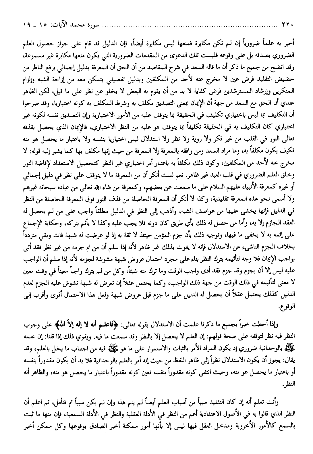 وإذا أحطت خبرا بجميع ما ذكرنا علمت أن الاستدلال بقوله تعالى: فَاعْلَمْ أَنَّهُ لا إِلهَ إِلَّا اللَّهُ على وجوب النظر فيه نظر لتوقفه على صحة قولهم: إن العلم لا يحصل إلا بالنظر وقد سمعت ما فيه. ويقوي ذلك إذا قلنا: إن علمه صلّى الله عليه وسلّم بالوحدانية ضروري إذ يكون المراد الأمر بالثبات والاستمرار على ما هو صلّى الله عليه وسلّم فيه من اجتناب ما يخل بالعلم، وقد يقال: يجوز أن يكون الاستدلال نظرا إلى ظاهر اللفظ من حيث إنه أمر بالعلم بالوحدانية فلا بد أن يكون مقدورا بنفسه أو باعتبار ما يحصل هو منه، وحيث انتفى كونه مقدورا بنفسه تعين كونه مقدورا باعتبار ما يحصل هو منه، والظاهر أنه النظر.