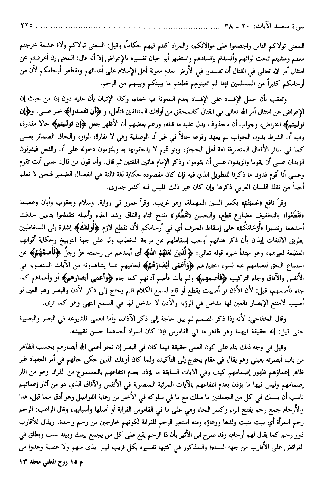 وقرأ نافع «عسيتم» بكسر السين المهملة، وهو غريب. وقرأ عمرو في رواية. وسلام ويعقوب وأبان وعصمة «تقطعوا» بالتخفيف مضارع قطع، والحسن «تقطّعوا» بفتح التاء والقاف وشد الطاء وأصله تتقطعوا بتاءين حذفت أحدهما ونصبوا «أرحامكم» على إسقاط الحرف أي في أرحامكم لأن تقطع لازم أُولئِكَ إشارة إلى المخاطبين بطريق الالتفات إيذان بأن ذكر هناتهم أوجب إسقاطهم عن درجة الخطاب ولو على جهة التوبيخ وحكاية أقوالهم الفظيعة لغيرهم، وهو مبتدأ خبره قوله تعالى: الَّذِينَ لَعَنَهُمُ اللَّهُ أي أبعدهم من رحمته عزّ وجلّ فَأَصَمَّهُمْ عن استماع الحق لتصامهم عنه لسوء اختيارهم وَأَعْمى أَبْصارَهُمْ لتعاميهم عما يشاهدونه من الآيات المنصوبة في الأنفس والآفاق وجاء التركيب فَأَصَمَّهُمْ ولم يأت فأصم آذانهم كما جاء وَأَعْمى أَبْصارَهُمْ أو وأعماهم كما جاء فأصمهم، قيل: لأن الأذن لو أصيبت بقطع أو قلع لسمع الكلام فلم يحتج إلى ذكر الأذن والبصر وهو العين لو أصيب لامتنع الإبصار فالعين لها مدخل في الرؤية والأذن لا مدخل لها في السمع انتهى وهو كما ترى.