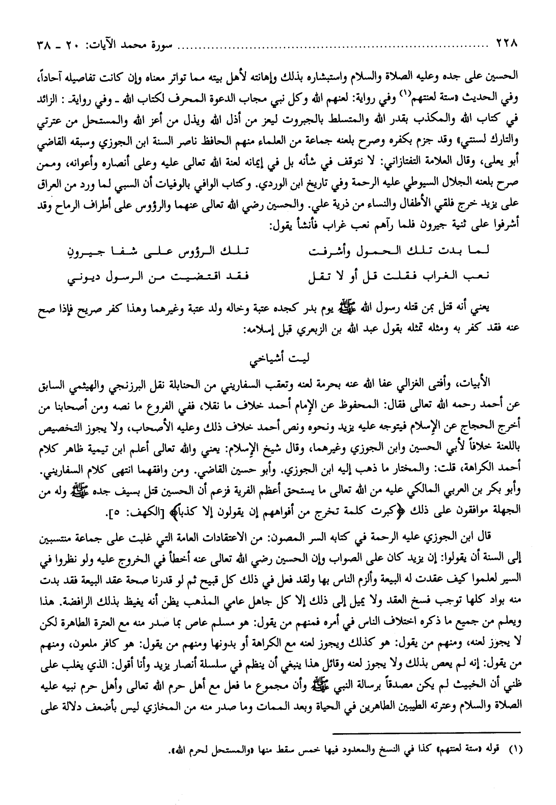 ليت أشياخي الأبيات، وأفتى الغزالي عفا الله عنه بحرمة لعنه وتعقب السفاريني من الحنابلة نقل البرزنجي والهيثمي السابق عن أحمد رحمه الله تعالى فقال: المحفوظ عن الإمام أحمد خلاف ما نقلا، ففي الفروع ما نصه ومن أصحابنا من أخرج الحجاج عن الإسلام فيتوجه عليه يزيد ونحوه ونص أحمد خلاف ذلك وعليه الأصحاب، ولا يجوز التخصيص باللعنة خلافا لأبي الحسين وابن الجوزي وغيرهما، وقال شيخ الإسلام: يعني والله تعالى أعلم ابن تيمية ظاهر كلام أحمد الكراهة، قلت: والمختار ما ذهب إليه ابن الجوزي. وأبو حسين القاضي. ومن وافقهما انتهى كلام السفاريني.