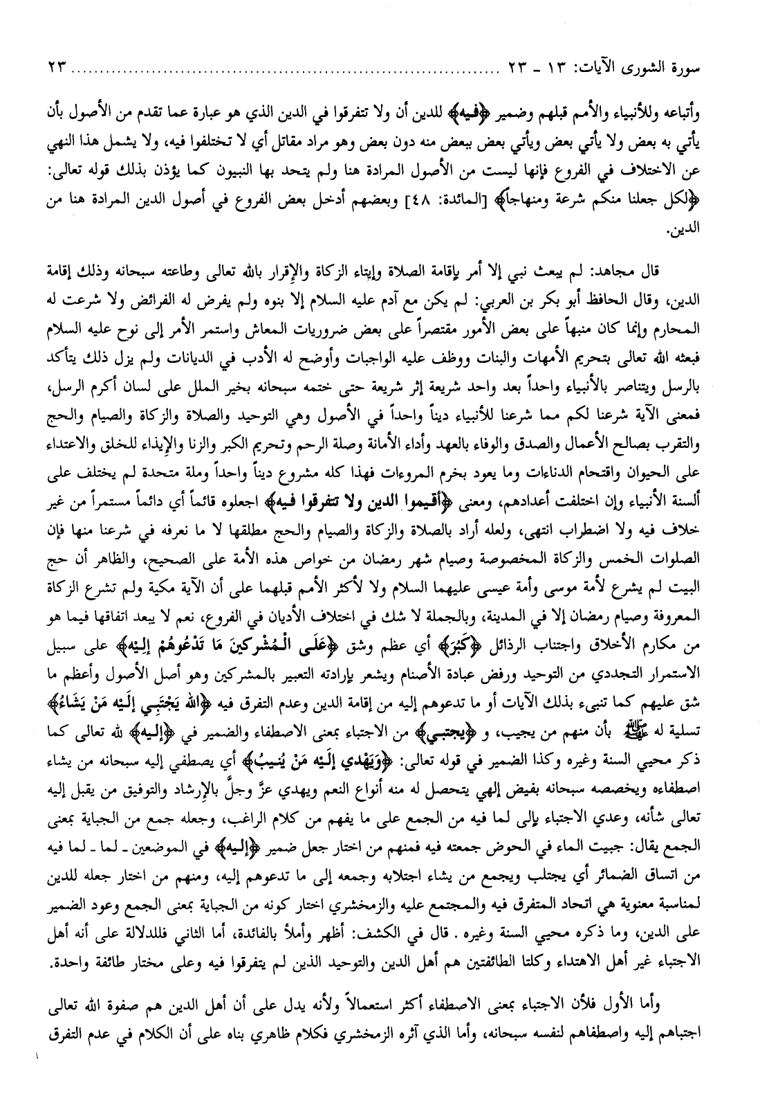 قال مجاهد: لم يبعث نبي إلا أمر بإقامة الصلاة وإيتاء الزكاة والإقرار بالله تعالى وطاعته سبحانه وذلك إقامة الدين، وقال الحافظ أبو بكر بن العربي: لم يكن مع آدم عليه السلام إلا بنوه ولم يفرض له الفرائض ولا شرعت له المحارم وإنما كان منبها على بعض الأمور مقتصرا على بعض ضروريات المعاش واستمر الأمر إلى نوح عليه السلام فبعثه الله تعالى بتحريم الأمهات والبنات ووظف عليه الواجبات وأوضح له الأدب في الديانات ولم يزل ذلك يتأكد بالرسل ويتناصر بالأنبياء واحدا بعد واحد شريعة إثر شريعة حتى ختمه سبحانه بخير الملل على لسان أكرم الرسل، فمعنى الآية شرعنا لكم مما شرعنا للأنبياء دينا واحدا في الأصول وهي التوحيد والصلاة والزكاة والصيام والحج والتقرب بصالح الأعمال والصدق والوفاء بالعهد وأداء الأمانة وصلة الرحم وتحريم الكبر والزنا والإيذاء للخلق والاعتداء على الحيوان واقتحام الدناءات وما يعود بخرم المروءات فهذا كله مشروع دينا واحدا وملة متحدة لم يختلف على ألسنة الأنبياء وإن اختلفت أعدادهم، ومعنى أَقِيمُوا الدِّينَ وَلا تَتَفَرَّقُوا فِيهِ اجعلوه قائما أي دائما مستمرا من غير خلاف فيه ولا اضطراب انتهى، ولعله أراد بالصلاة والزكاة والصيام والحج مطلقها لا ما نعرفه في شرعنا منها فإن الصلوات الخمس والزكاة المخصوصة وصيام شهر رمضان من خواص هذه الأمة على الصحيح، والظاهر أن حج البيت لم يشرع لأمة موسى وأمة عيسى عليهما السلام ولا لأكثر الأمم قبلهما على أن الآية مكية ولم تشرع الزكاة المعروفة وصيام رمضان إلا في المدينة، وبالجملة لا شك في اختلاف الأديان في الفروع، نعم لا يبعد اتفاقها فيما هو من مكارم الأخلاق واجتناب الرذائل كَبُرَ أي عظم وشق عَلَى الْمُشْرِكِينَ ما تَدْعُوهُمْ إِلَيْهِ على سبيل الاستمرار التجددي من التوحيد ورفض عبادة الأصنام ويشعر بإرادته التعبير بالمشركين وهو أصل الأصول وأعظم ما شق عليهم كما تنبىء بذلك الآيات أو ما تدعوهم إليه من إقامة الدين وعدم التفرق فيه اللَّهُ يَجْتَبِي إِلَيْهِ مَنْ يَشاءُ تسلية له صلّى الله عليه وسلّم بأن منهم من يجيب، ويَجْتَبِي من الاجتباء بمعنى الاصطفاء والضمير في إِلَيْهِ لله تعالى كما ذكر محيي السنة وغيره وكذا الضمير في قوله تعالى: وَيَهْدِي إِلَيْهِ مَنْ يُنِيبُ أي يصطفي إليه سبحانه من يشاء اصطفاءه ويخصصه سبحانه بفيض إلهي يتحصل له منه أنواع النعم ويهدي عزّ وجلّ بالإرشاد والتوفيق من يقبل إليه تعالى شأنه، وعدي الاجتباء بإلى لما فيه من الجمع على ما يفهم من كلام الراغب، وجعله جمع من الجباية بمعنى الجمع يقال: جبيت الماء في الحوض جمعته فيه فمنهم من اختار جعل ضمير إِلَيْهِ في الموضعين- لما- لما فيه من اتساق الضمائر أي يجتلب ويجمع من يشاء اجتلابه وجمعه إلى ما تدعوهم إليه، ومنهم من اختار جعله للدين لمناسبة معنوية هي اتحاد المتفرق فيه والمجتمع عليه والزمخشري اختار كونه من الجباية بمعنى الجمع وعود الضمير على الدين، وما ذكره محيي السنة وغيره. قال في الكشف: أظهر وأملأ بالفائدة، أما الثاني فللدلالة على أنه أهل الاجتباء غير أهل الاهتداء وكلتا الطائفتين هم أهل الدين والتوحيد الذين لم يتفرقوا فيه وعلى مختار طائفة واحدة.