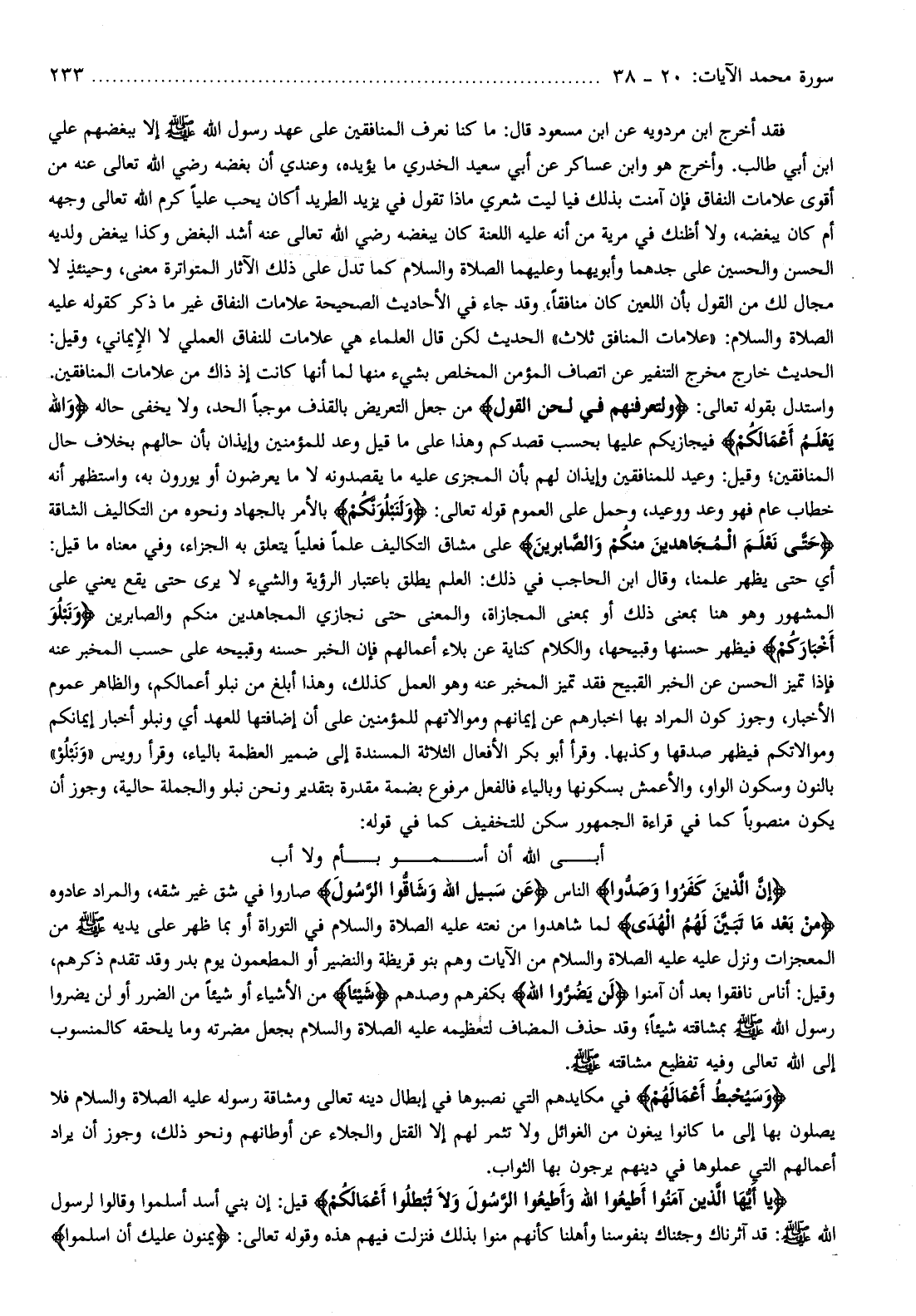 واستدل بقوله تعالى: وَلَتَعْرِفَنَّهُمْ فِي لَحْنِ الْقَوْلِ من جعل التعريض بالقذف موجبا الحد، ولا يخفى حاله وَاللَّهُ يَعْلَمُ أَعْمالَكُمْ فيجازيكم عليها بحسب قصدكم وهذا على ما قيل وعد للمؤمنين وإيذان بأن حالهم بخلاف حال المنافقين وقيل: وعيد للمنافقين وإيذان لهم بأن المجزى عليه ما يقصدونه لا ما يعرضون أو يورون به، واستظهر أنه خطاب عام فهو وعد ووعيد، وحمل على العموم قوله تعالى: وَلَنَبْلُوَنَّكُمْ بالأمر بالجهاد ونحوه من التكاليف الشاقة حَتَّى نَعْلَمَ الْمُجاهِدِينَ مِنْكُمْ وَالصَّابِرِينَ على مشاق التكاليف علما فعليا يتعلق به الجزاء، وفي معناه ما قيل:
