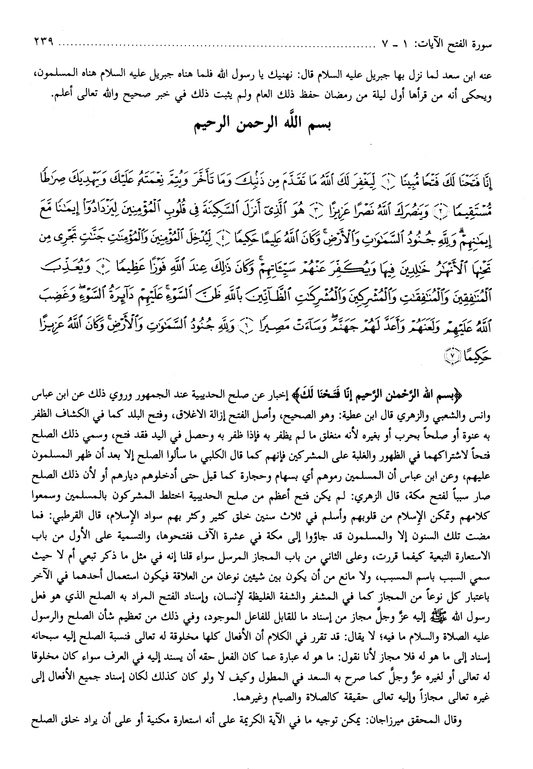 بِسْمِ اللَّهِ الرَّحْمنِ الرَّحِيمِ إِنَّا فَتَحْنا لَكَ إخبار عن صلح الحديبية عند الجمهور وروي ذلك عن ابن عباس وانس والشعبي والزهري قال ابن عطية: وهو الصحيح، وأصل الفتح إزالة الاغلاق، وفتح البلد كما في الكشاف الظفر به عنوة أو صلحا بحرب أو بغيره لأنه منغلق ما لم يظفر به فإذا ظفر به وحصل في اليد فقد فتح، وسمي ذلك الصلح فتحا لاشتراكهما في الظهور والغلبة على المشركين فإنهم كما قال الكلبي ما سألوا الصلح إلا بعد أن ظهر المسلمون عليهم، وعن ابن عباس أن المسلمين رموهم أي بسهام وحجارة كما قيل حتى أدخلوهم ديارهم أو لأن ذلك الصلح صار سببا لفتح مكة، قال الزهري: لم يكن فتح أعظم من صلح الحديبية اختلط المشركون بالمسلمين وسمعوا كلامهم وتمكن الإسلام من قلوبهم وأسلم في ثلاث سنين خلق كثير وكثر بهم سواد الإسلام، قال القرطبي: فما مضت تلك السنون إلا والمسلمون قد جاؤوا إلى مكة في عشرة آلاف ففتحوها، والتسمية على الأول من باب الاستعارة التبعية كيفما قررت، وعلى الثاني من باب المجاز المرسل سواء قلنا إنه في مثل ما ذكر تبعي أم لا حيث سمي السبب باسم المسبب، ولا مانع من أن يكون بين شيئين نوعان من العلاقة فيكون استعمال أحدهما في الآخر باعتبار كل نوعا من المجاز كما في المشفر والشفة الغليظة لإنسان، وإسناد الفتح المراد به الصلح الذي هو فعل رسول الله صلّى الله عليه وسلّم إليه عزّ وجلّ مجاز من إسناد ما للقابل للفاعل الموجود، وفي ذلك من تعظيم شأن الصلح والرسول عليه الصلاة والسلام ما فيه لا يقال: قد تقرر في الكلام أن الأفعال كلها مخلوقة له تعالى فنسبة الصلح إليه سبحانه إسناد إلى ما هو له فلا مجاز لأنا نقول: ما هو له عبارة عما كان الفعل حقه أن يسند إليه في العرف سواء كان مخلوقا له تعالى أو لغيره عزّ وجلّ كما صرح به السعد في المطول وكيف لا ولو كان كذلك لكان إسناد جميع الأفعال إلى غيره تعالى مجازا وإليه تعالى حقيقة كالصلاة والصيام وغيرهما.