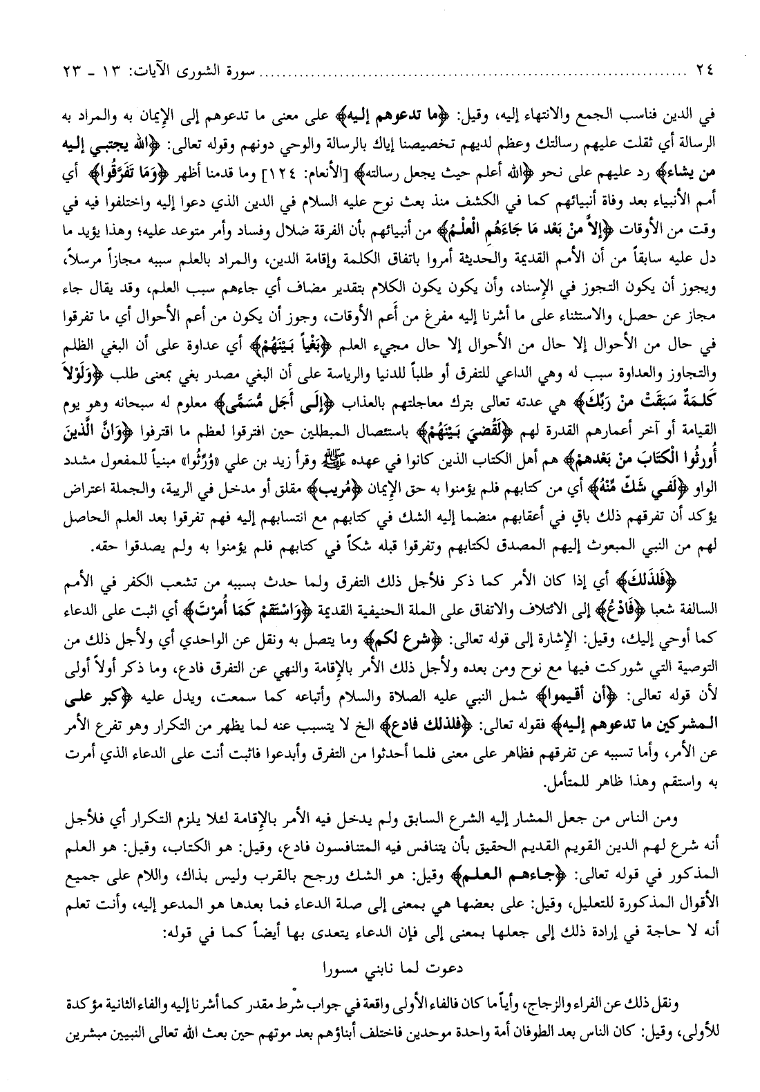 في الدين فناسب الجمع والانتهاء إليه، وقيل: ما تَدْعُوهُمْ إِلَيْهِ على معنى ما تدعوهم إلى الإيمان به والمراد به الرسالة أي ثقلت عليهم رسالتك وعظم لديهم تخصيصنا إياك بالرسالة والوحي دونهم وقوله تعالى: اللَّهُ يَجْتَبِي إِلَيْهِ مَنْ يَشاءُ رد عليهم على نحو اللَّهُ أَعْلَمُ حَيْثُ يَجْعَلُ رِسالَتَهُ [الأنعام: 124] وما قدمنا أظهر وَما تَفَرَّقُوا أي أمم الأنبياء بعد وفاة أنبيائهم كما في الكشف منذ بعث نوح عليه السلام في الدين الذي دعوا إليه واختلفوا فيه في وقت من الأوقات إِلَّا مِنْ بَعْدِ ما جاءَهُمُ الْعِلْمُ من أنبيائهم بأن الفرقة ضلال وفساد وأمر متوعد عليه وهذا يؤيد ما دل عليه سابقا من أن الأمم القديمة والحديثة أمروا باتفاق الكلمة وإقامة الدين، والمراد بالعلم سببه مجازا مرسلا، ويجوز أن يكون التجوز في الإسناد، وأن يكون يكون الكلام بتقدير مضاف أي جاءهم سبب العلم، وقد يقال جاء مجاز عن حصل، والاستثناء على ما أشرنا إليه مفرغ من أعم الأوقات، وجوز أن يكون من أعم الأحوال أي ما تفرقوا في حال من الأحوال إلا حال من الأحوال إلا حال مجيء العلم بَغْياً بَيْنَهُمْ أي عداوة على أن البغي الظلم والتجاوز والعداوة سبب له وهي الداعي للتفرق أو طلبا للدنيا والرياسة على أن البغي مصدر بغي بمعنى طلب وَلَوْلا كَلِمَةٌ سَبَقَتْ مِنْ رَبِّكَ هي عدته تعالى بترك معاجلتهم بالعذاب إِلى أَجَلٍ مُسَمًّى معلوم له سبحانه وهو يوم القيامة أو آخر أعمارهم القدرة لهم لَقُضِيَ بَيْنَهُمْ باستئصال المبطلين حين افترقوا لعظم ما اقترفوا وَإِنَّ الَّذِينَ أُورِثُوا الْكِتابَ مِنْ بَعْدِهِمْ هم أهل الكتاب الذين كانوا في عهده صلّى الله عليه وسلّم وقرأ زيد بن علي «ورّثوا» مبنيا للمفعول مشدد الواو لَفِي شَكٍّ مِنْهُ أي من كتابهم فلم يؤمنوا به حق الإيمان مُرِيبٍ مقلق أو مدخل في الريبة، والجملة اعتراض يؤكد أن تفرقهم ذلك باق في أعقابهم منضما إليه الشك في كتابهم مع انتسابهم إليه فهم تفرقوا بعد العلم الحاصل لهم من النبي المبعوث إليهم المصدق لكتابهم وتفرقوا قبله شكا في كتابهم فلم يؤمنوا به ولم يصدقوا حقه.