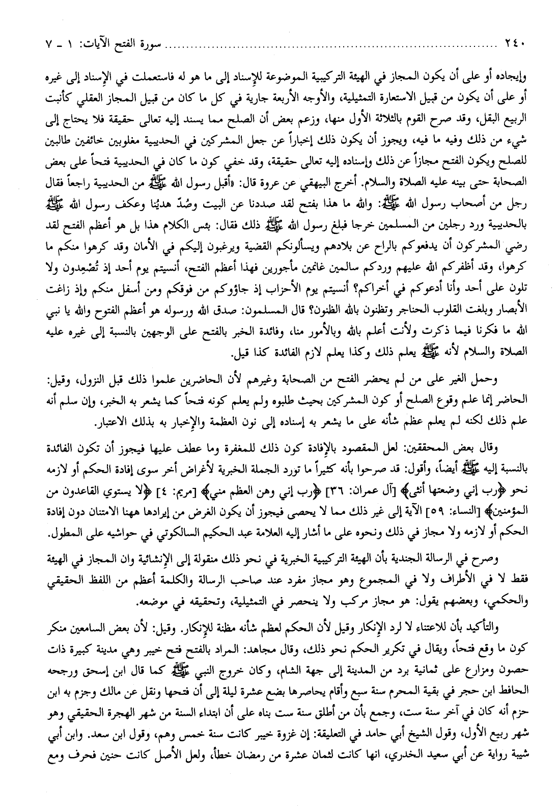 وإيجاده أو على أن يكون المجاز في الهيئة التركيبية الموضوعة للإسناد إلى ما هو له فاستعملت في الإسناد إلى غيره أو على أن يكون من قبيل الاستعارة التمثيلية، والأوجه الأربعة جارية في كل ما كان من قبيل المجاز العقلي كأنبت الربيع البقل، وقد صرح القوم بالثلاثة الأول منها، وزعم بعض أن الصلح مما يسند إليه تعالى حقيقة فلا يحتاج إلى شيء من ذلك وفيه ما فيه، ويجوز أن يكون ذلك إخبارا عن جعل المشركين في الحديبية مغلوبين خائفين طالبين للصلح ويكون الفتح مجازا عن ذلك وإسناده إليه تعالى حقيقة، وقد خفي كون ما كان في الحديبية فتحا على بعض الصحابة حتى بينه عليه الصلاة والسلام.