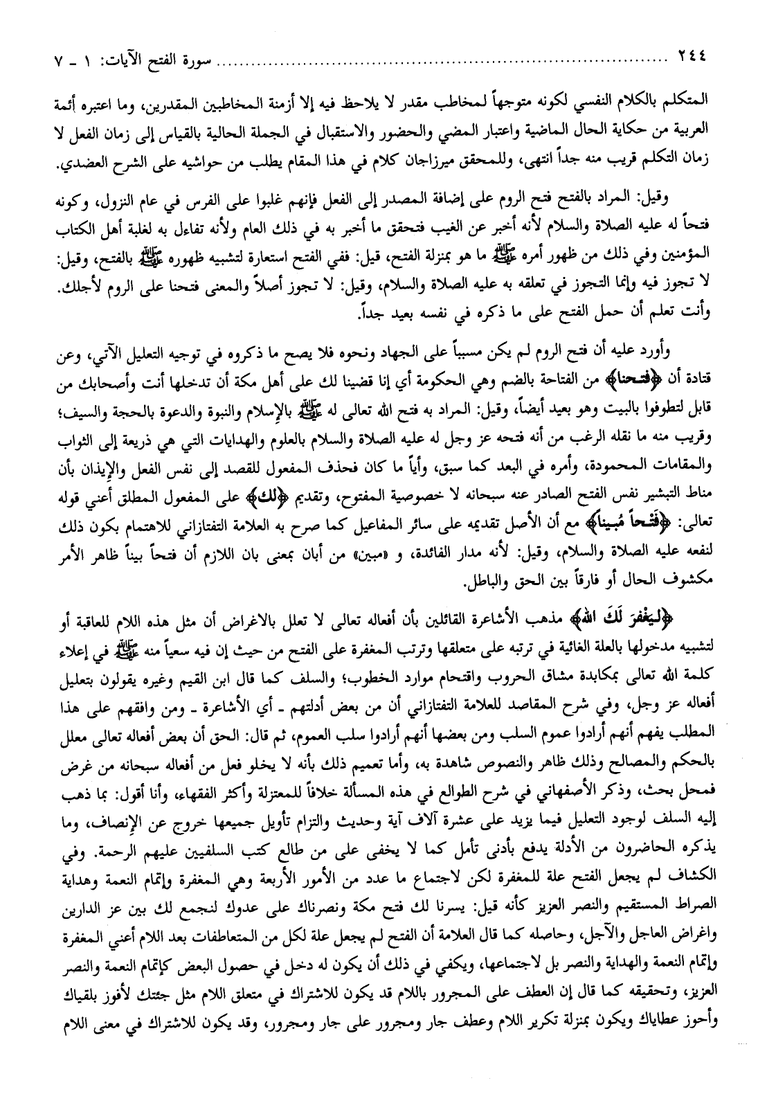 لِيَغْفِرَ لَكَ اللَّهُ مذهب الأشاعرة القائلين بأن أفعاله تعالى لا تعلل بالأغراض أن مثل هذه اللام للعاقبة أو لتشبيه مدخولها بالعلة الغائية في ترتبه على متعلقها وترتب المغفر على الفتح من حيث إن فيه سعيا منه صلّى الله عليه وسلّم في إعلاء كلمة الله تعالى بمكابدة مشاق الحروب واقتحام موارد الخطوب والسلف كما قال ابن القيم وغيره يقولون بتعليل أفعاله عز وجل، وفي شرح المقاصد للعلامة التفتازاني أن من بعض أدلتهم- أي الأشاعرة- ومن وافقهم على هذا المطلب يفهم أنهم أرادوا عموم السلب ومن بعضها أنهم أرادوا سلب العموم، ثم قال: الحق أن بعض أفعاله تعالى معلل بالحكم والمصالح وذلك ظاهر والنصوص شاهدة به، وأما تعميم ذلك بأنه لا يخلو فعل من أفعاله سبحانه من غرض فمحل بحث، وذكر الأصفهاني في شرح الطوالع في هذه المسألة خلافا للمعتزلة وأكثر الفقهاء، وأنا أقول: بما ذهب إليه السلف لوجود التعليل فيما يزيد على عشرة آلاف آية وحديث والتزام تأويل جميعها خروج عن الإنصاف، وما يذكره الحاضرون من الأدلة يدفع بأدنى تأمل كما لا يخفى على من طالع كتب السلفيين عليهم الرحمة. وفي الكشاف لم يجعل الفتح علة للمغفرة لكن لاجتماع ما عدد من الأمور الأربعة وهي المغفرة وإتمام النعمة وهداية الصراط المستقيم والنصر العزيز كأنه قيل: يسرنا لك فتح مكة ونصرناك على عدوك لنجمع لك بين عز الدارين واغراض العاجل والآجل، وحاصله كما قال العلامة أن الفتح لم يجعل علة لكل من المتعاطفات بعد اللام أعني المغفرة وإتمام النعمة والهداية والنصر بل لاجتماعها، ويكفي في ذلك أن يكون له دخل في حصول البعض كإتمام النعمة والنصر العزيز، وتحقيقه كما قال إن العطف على المجرور باللام قد يكون للاشتراك في متعلق اللام مثل جئتك لأفوز بلقياك وأحوز عطاياك ويكون بمنزلة تكرير اللام وعطف جار ومجرور على جار ومجرور، وقد يكون للاشتراك في معنى اللام