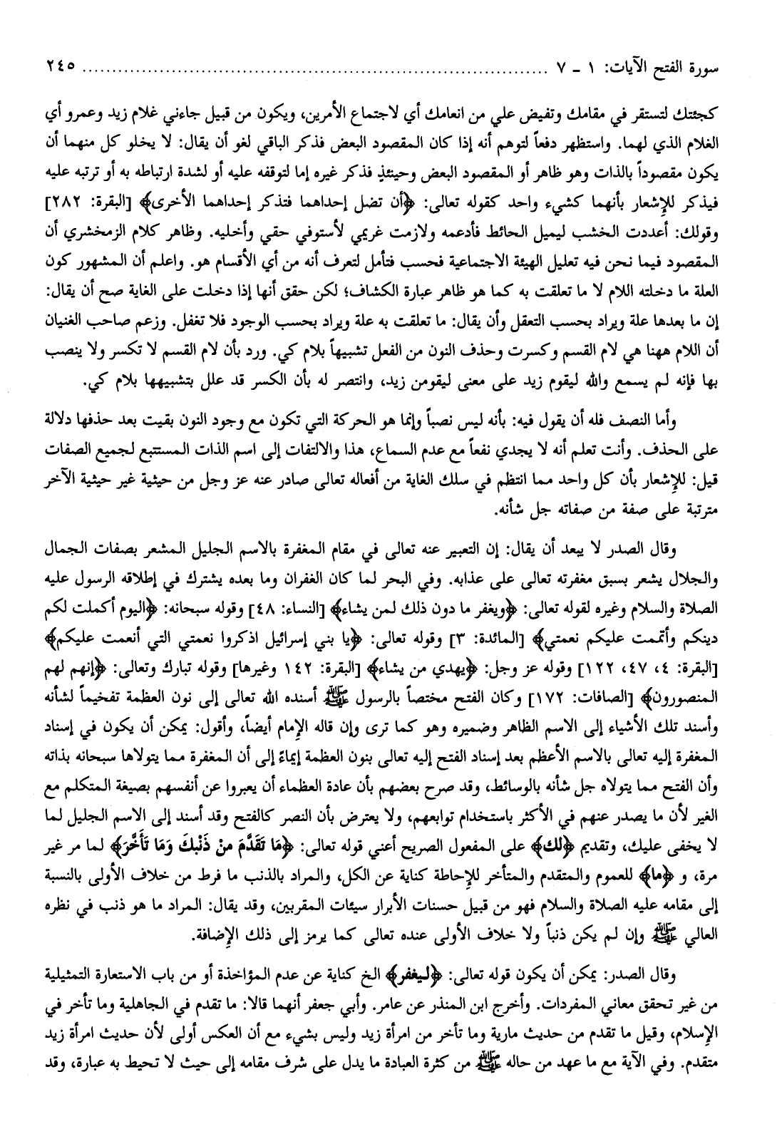 وقال الصدر لا يبعد أن يقال: إن التعبير عنه تعالى في مقام المغفرة بالاسم الجليل المشعر بصفات الجمال والجلال يشعر بسبق مغفرته تعالى على عذابه. وفي البحر لما كان الغفران وما بعده يشترك في إطلاقه الرسول عليه الصلاة والسلام وغيره لقوله تعالى: وَيَغْفِرُ ما دُونَ ذلِكَ لِمَنْ يَشاءُ [النساء: 48] وقوله سبحانه: الْيَوْمَ أَكْمَلْتُ لَكُمْ دِينَكُمْ وَأَتْمَمْتُ عَلَيْكُمْ نِعْمَتِي [المائدة: 3] وقوله تعالى: يا بَنِي إِسْرائِيلَ اذْكُرُوا نِعْمَتِيَ الَّتِي أَنْعَمْتُ عَلَيْكُمْ [البقرة: 40، 47، 122] وقوله عز وجل: يَهْدِي مَنْ يَشاءُ [البقرة: 142 وغيرها] وقوله تبارك وتعالى: إِنَّهُمْ لَهُمُ الْمَنْصُورُونَ [الصافات: 172] وكان الفتح مختصا بالرسول صلّى الله عليه وسلّم أسنده الله تعالى إلى نون العظمة تفخيما لشأنه وأسند تلك الأشياء إلى الاسم الظاهر وضميره وهو كما ترى وإن قاله الإمام أيضا، وأقول: يمكن أن يكون في إسناد المغفرة إليه تعالى بالاسم الأعظم بعد إسناد الفتح إليه تعالى بنون العظمة إيماء إلى أن المغفرة مما يتولاها سبحانه بذاته وأن الفتح مما يتولاه جل شأنه بالوسائط، وقد صرح بعضهم بأن عادة العظماء أن يعبروا عن أنفسهم بصيغة المتكلم مع الغير لأن ما يصدر عنهم في الأكثر باستخدام توابعهم، ولا يعترض بأن النصر كالفتح وقد أسند إلى الاسم الجليل لما لا يخفى عليك، وتقديم لَكَ على المفعول الصريح أعني قوله تعالى: ما تَقَدَّمَ مِنْ ذَنْبِكَ وَما تَأَخَّرَ لما مر غير مرة، وما للعموم والمتقدم والمتأخر للإحاطة كناية عن الكل، والمراد بالذنب ما فرط من خلاف الأولى بالنسبة إلى مقامه عليه الصلاة والسلام فهو من قبيل حسنات الأبرار سيئات المقربين، وقد يقال: المراد ما هو ذنب في نظره العالي صلّى الله عليه وسلّم وإن لم يكن ذنبا ولا خلاف الأولى عنده تعالى كما يرمز إلى ذلك الإضافة.