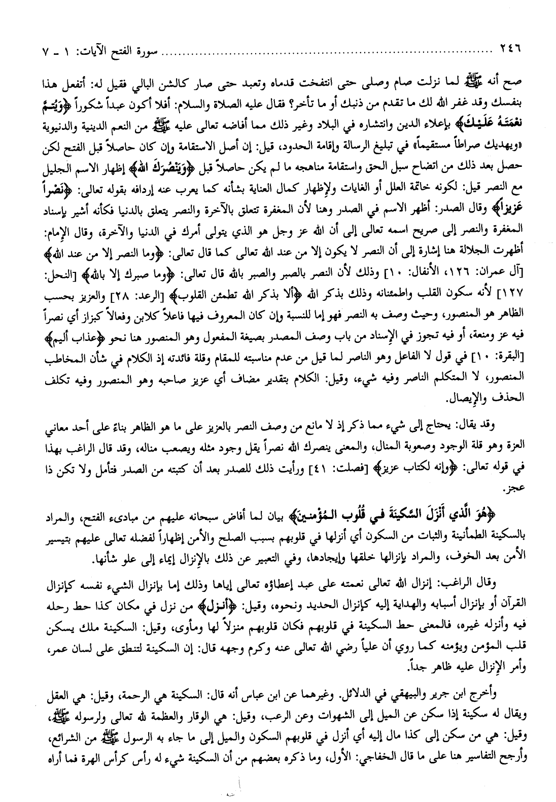 127] لأنه سكون القلب واطمئنانه وذلك بذكر الله أَلا بِذِكْرِ اللَّهِ تَطْمَئِنُّ الْقُلُوبُ [الرعد: 28] والعزيز بحسب الظاهر هو المنصور، وحيث وصف به النصر فهو إما للنسبة وإن كان المعروف فيها فاعلا كلابن وفعالا كبزاز أي نصرا فيه عز ومنعة، أو فيه تجوز في الإسناد من باب وصف المصدر بصيغة المفعول وهو المنصور هنا نحو عَذابٌ أَلِيمٌ [البقرة: 10] في قول لا الفاعل وهو الناصر لما قيل من عدم مناسبته للمقام وقلة فائدته إذ الكلام في شأن المخاطب المنصور، لا المتكلم الناصر وفيه شيء، وقيل: الكلام بتقدير مضاف أي عزيز صاحبه وهو المنصور وفيه تكلف الحذف والإيصال.