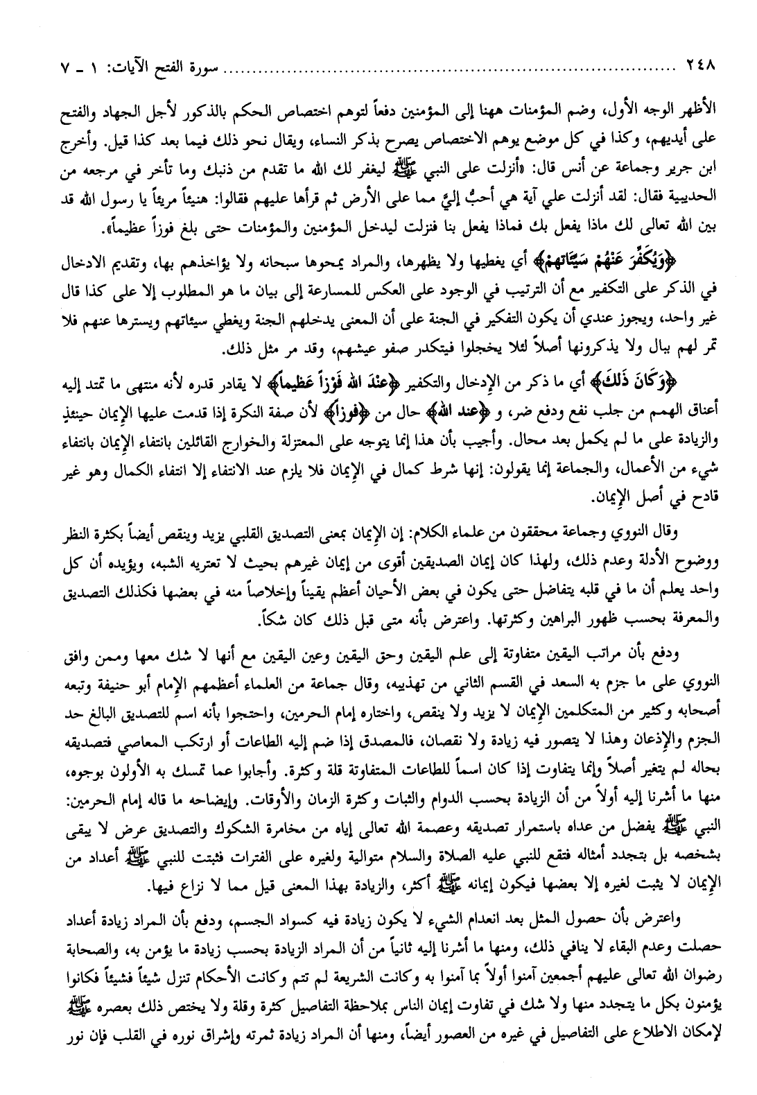 ودفع بأن مراتب اليقين متفاوتة إلى علم اليقين وحق اليقين وعين اليقين مع أنها لا شك معها وممن وافق النووي على ما جزم به السعد في القسم الثاني من تهذيبه، وقال جماعة من العلماء أعظمهم الإمام أبو حنيفة وتبعه أصحابه وكثير من المتكلمين الإيمان لا يزيد ولا ينقص، واختاره إمام الحرمين، واحتجوا بأنه اسم للتصديق البالغ حد الجزم والإذعان وهذا لا يتصور فيه زيادة ولا نقصان، فالمصدق إذا ضم إليه الطاعات أو ارتكب المعاصي فتصديقه بحاله لم يتغير أصلا وإنما يتفاوت إذا كان اسما للطاعات المتفاوتة قلة وكثرة. وأجابوا عما تمسك به الأولون بوجوه، منها ما أشرنا إليه أولا من أن الزيادة بحسب الدوام والثبات وكثرة الزمان والأوقات. وإيضاحه ما قاله إمام الحرمين: