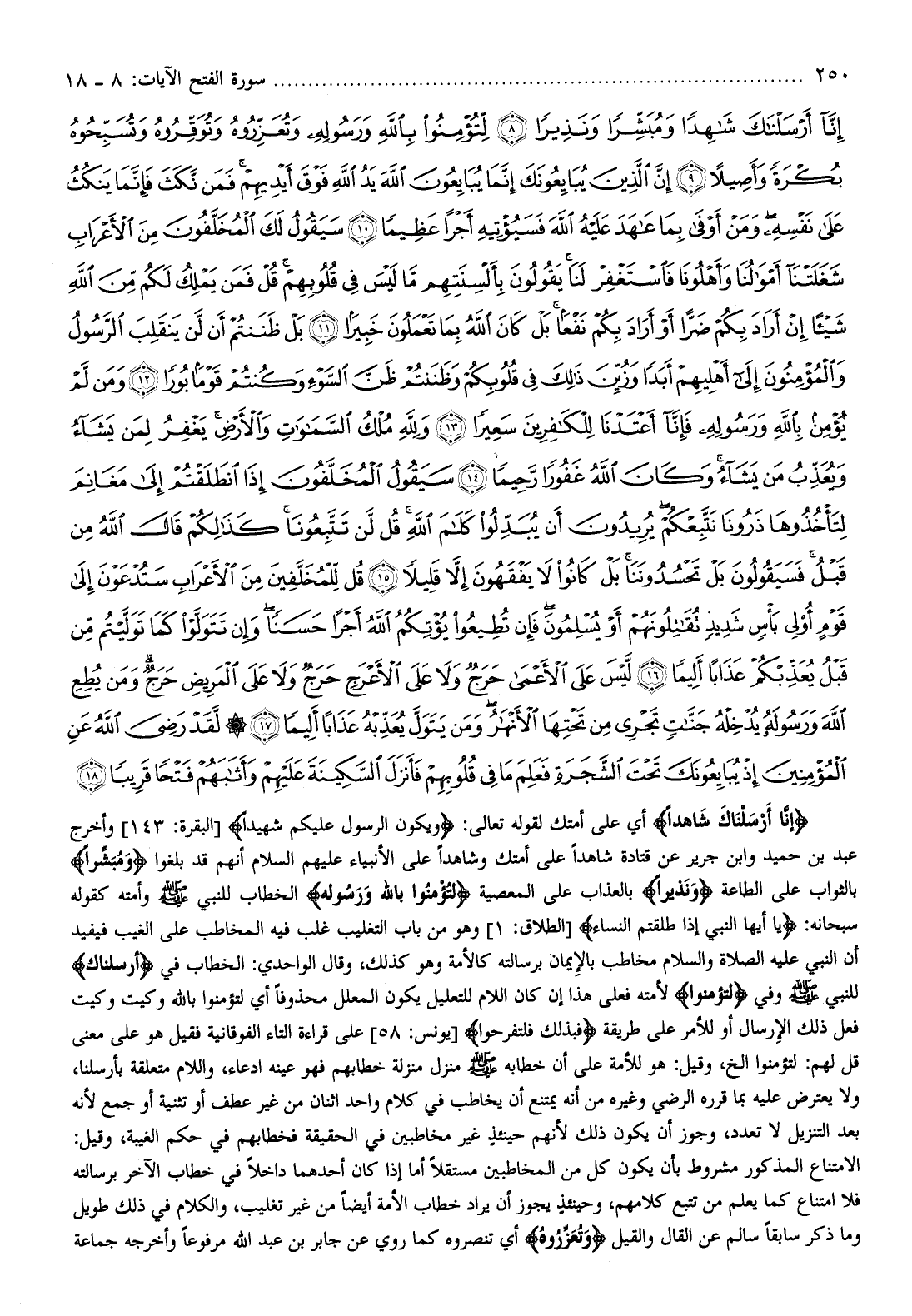 إِنَّا أَرْسَلْناكَ شاهِداً أي على أمتك لقوله تعالى: وَيَكُونَ الرَّسُولُ عَلَيْكُمْ شَهِيداً [البقرة: 143] وأخرج عبد بن حميد وابن جرير عن قتادة شاهدا على أمتك وشاهدا على الأنبياء عليهم السلام أنهم قد بلغوا وَمُبَشِّراً بالثواب على الطاعة وَنَذِيراً بالعذاب على المعصية لِتُؤْمِنُوا بِاللَّهِ وَرَسُولِهِ الخطاب للنبي صلّى الله عليه وسلّم وأمته كقوله سبحانه: يا أَيُّهَا النَّبِيُّ إِذا طَلَّقْتُمُ النِّساءَ [الطلاق: 1] وهو من باب التغليب غلب فيه المخاطب على الغيب فيفيد أن النبي عليه الصلاة والسلام مخاطب بالإيمان برسالته كالأمة وهو كذلك، وقال الواحدي: الخطاب في أَرْسَلْناكَ للنبي صلّى الله عليه وسلّم وفي لِتُؤْمِنُوا لأمته فعلى هذا إن كان اللام للتعليل يكون المعلل محذوفا أي لتؤمنوا بالله وكيت وكيت فعل ذلك الإرسال أو للأمر على طريقة فبذلك فلتفرحوا [يونس: 58] على قراءة التاء الفوقانية فقيل هو على معنى قل لهم: لتؤمنوا إلخ، وقيل: هو للأمة على أن خطابه صلّى الله عليه وسلّم منزل منزلة خطابهم فهو عينه ادعاء، واللام متعلقة بأرسلنا، ولا يعترض عليه بما قرره الرضي وغيره من أنه يمتنع أن يخاطب في كلام واحد اثنان من غير عطف أو تثنية أو جمع لأنه بعد التنزيل لا تعدد، وجوز أن يكون ذلك لأنهم حينئذ غير مخاطبين في الحقيقة فخطابهم في حكم الغيبة، وقيل: