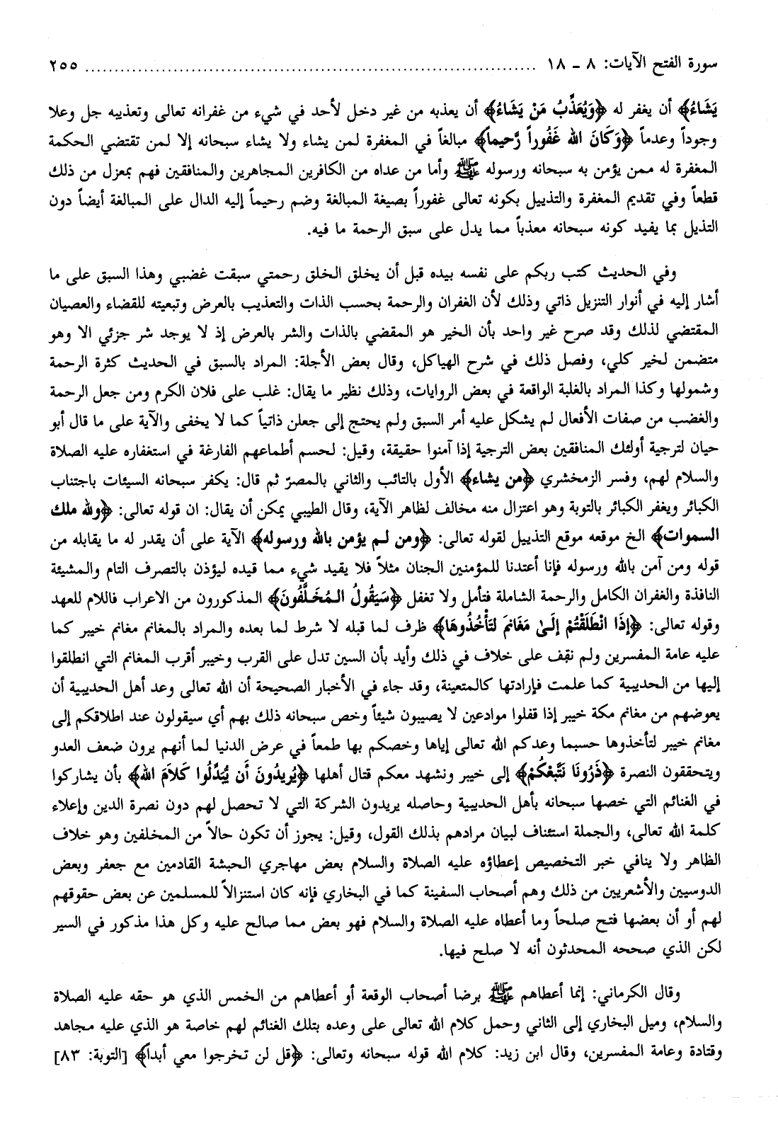 وهذا السبق على ما أشار إليه في أنوار التنزيل ذاتي وذلك لأن الغفران والرحمة بحسب الذات والتعذيب بالعرض وتبعيته للقضاء والعصيان المقتضي لذلك وقد صرح غير واحد بأن الخير هو المقضي بالذات والشر بالعرض إذ لا يوجد شر جزئي الا وهو متضمن لخير كلي، وفصل ذلك في شرح الهياكل، وقال بعض الأجلة: المراد بالسبق في الحديث كثرة الرحمة وشمولها وكذا المراد بالغلبة الواقعة في بعض الروايات، وذلك نظير ما يقال: غلب على فلان الكرم ومن جعل الرحمة والغضب من صفات الأفعال لم يشكل عليه أمر السبق ولم يحتج إلى جعلن ذاتيا كما لا يخفى والآية على ما قال أبو حيان لترجية أولئك المنافقين بعض الترجية إذا آمنوا حقيقة، وقيل: لحسم أطماعهم الفارغة في استغفاره عليه الصلاة والسلام لهم، وفسر الزمخشري مَنْ يَشاءُ الأول بالتائب والثاني بالمصرّ ثم قال: يكفر سبحانه السيئات باجتناب الكبائر ويغفر الكبائر بالتوبة وهو اعتزال منه مخالف لظاهر الآية، وقال الطيبي يمكن أن يقال: ان قوله تعالى: وَلِلَّهِ مُلْكُ السَّماواتِ إلخ موقعه موقع التذييل لقوله تعالى: وَمَنْ لَمْ يُؤْمِنْ بِاللَّهِ وَرَسُولِهِ الآية على أن يقدر له ما يقابله من قوله ومن آمن بالله ورسوله فإنا أعتدنا للمؤمنين الجنان مثلا فلا يقيد شيء مما قيده ليؤذن بالتصرف التام والمشيئة النافذة والغفران الكامل والرحمة الشاملة فتأمل ولا تغفل سَيَقُولُ الْمُخَلَّفُونَ المذكورون من الاعراب فاللام للعهد وقوله تعالى: إِذَا انْطَلَقْتُمْ إِلى مَغانِمَ لِتَأْخُذُوها ظرف لما قبله لا شرط لما بعده والمراد بالمغانم مغانم خيبر كما عليه عامة المفسرين ولم نقف على خلاف في ذلك وأيد بأن السين تدل على القرب وخيبر أقرب المغانم التي انطلقوا إليها من الحديبية كما علمت فإرادتها كالمتعينة، وقد جاء في الأخبار الصحيحة أن الله تعالى وعد أهل الحديبية أن يعوضهم من مغانم مكة خيبر إذا قفلوا موادعين لا يصيبون شيئا وخص سبحانه ذلك بهم أي سيقولون عند إطلاقكم إلى مغانم خيبر لتأخذوها حسبما وعدكم الله تعالى إياها وخصكم بها طمعا في عرض الدنيا لما أنهم يرون ضعف العدو ويتحققون النصرة ذَرُونا نَتَّبِعْكُمْ إلى خيبر ونشهد معكم قتال أهلها يُرِيدُونَ أَنْ يُبَدِّلُوا كَلامَ اللَّهِ بأن يشاركوا في الغنائم التي خصها سبحانه بأهل الحديبية وحاصله يريدون الشركة التي لا تحصل لهم دون نصرة الدين وإعلاء كلمة الله تعالى، والجملة استئناف لبيان مرادهم بذلك القول، وقيل: يجوز أن تكون حالا من المخلفين وهو خلاف الظاهر ولا ينافي خبر التخصيص إعطاؤه عليه الصلاة والسلام بعض مهاجري الحبشة القادمين مع جعفر وبعض الدوسيين والأشعريين من ذلك وهم أصحاب السفينة كما في البخاري فإنه كان استنزالا للمسلمين عن بعض حقوقهم لهم أو أن بعضها فتح صلحا وما أعطاه عليه الصلاة والسلام فهو بعض مما صالح عليه وكل هذا مذكور في السير لكن الذي صححه المحدثون أنه لا صلح فيها.