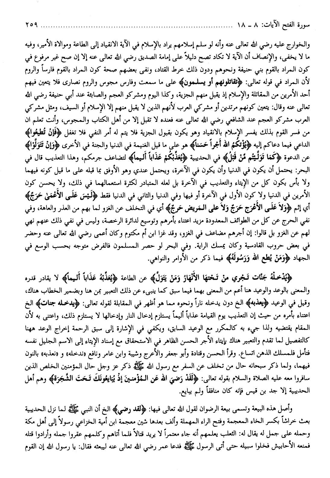 والخوارج عليه رضي الله تعالى عنه وأنه لو سلّم إسلامهم يراد بالإسلام في الآية الانقياد إلى الطاعة وموالاة الأمير، وفيه ما لا يخفى، والإنصاف أن الآية لا تكاد تصح دليلا على إمامة الصديق رضي الله تعالى عنه إلا إن صح غير مرفوع في كون المراد بالقوم بني حنيفة ونحوهم ودون ذلك خرط القتاد، ونفى بعضهم صحة كون المراد بالقوم فارسا والروم لأن المراد في قوله تعالى: تُقاتِلُونَهُمْ أَوْ يُسْلِمُونَ على ما سمعت وفارس مجوس والروم نصارى فلا يتعين فيهم أحد الأمرين من المقاتلة والإسلام إذ يقبل منهم الجزية، وكذا اليوم ومشركو العجم والصابئة عند أبي حنيفة رضي الله تعالى عنه وقال: يتعين كونهم مرتدين أو مشركي العرب لأنهم الذين لا يقبل منهم إلا الإسلام أو السيف، ومثل مشركي العرب مشركو العجم عند الشافعي رضي الله تعالى عنه فعنده لا تقبل إلا من أهل الكتاب والمجوس، وأنت تعلم ان من فسر القوم بذلك يفسر الإسلام بالانقياد وهو يكون بقبول الجزية فلا يتم له أمر النفي فلا تغفل فَإِنْ تُطِيعُوا الداعي فيما دعاكم إليه يُؤْتِكُمُ اللَّهُ أَجْراً حَسَناً هو على ما قيل الغنيمة في الدنيا والجنة في الأخرى وَإِنْ تَتَوَلَّوْا عن الدعوة كَما تَوَلَّيْتُمْ مِنْ قَبْلُ في الحديبية يُعَذِّبْكُمْ عَذاباً أَلِيماً لتضاعف جرمكم، وهذا التعذيب قال في البحر: يحتمل أن يكون في الدنيا وأن يكون في الآخرة، ويحتمل عندي وهو الأوفق بما قبله على ما قيل كونه فيهما ولا بأس بكون كل من الإيتاء والتعذيب في الآخرة بل لعله المتبادر لكثرة استعمالهما في ذلك، ولا يحسن كون الأمرين في الدنيا ولا كون الأول في الآخرة أو فيها وفي الدنيا والثاني في الدنيا فقط لَيْسَ عَلَى الْأَعْمى حَرَجٌ أي إثم وَلا عَلَى الْأَعْرَجِ حَرَجٌ وَلا عَلَى الْمَرِيضِ حَرَجٌ أي في التخلف عن الغزو لما بهم من العذر والعاهة، وفي نفي الحرج عن كل من الطوائف المعدودة مزيد اعتناء بأمرهم وتوسيع لدائرة الرخصة، وليس في نفي ذلك عنهم نهي لهم عن الغزو بل قالوا: إن أجرهم مضاعف في الغزو، وقد غزا ابن أم مكتوم وكان أعمى رضي الله تعالى عنه وحضر في بعض حروب القادسية وكان يمسك الراية. وفي البحر لو حصر المسلمون فالفرض متوجه بحسب الوسع في الجهاد وَمَنْ يُطِعِ اللَّهَ وَرَسُولَهُ فيما ذكر من الأوامر والنواهي.