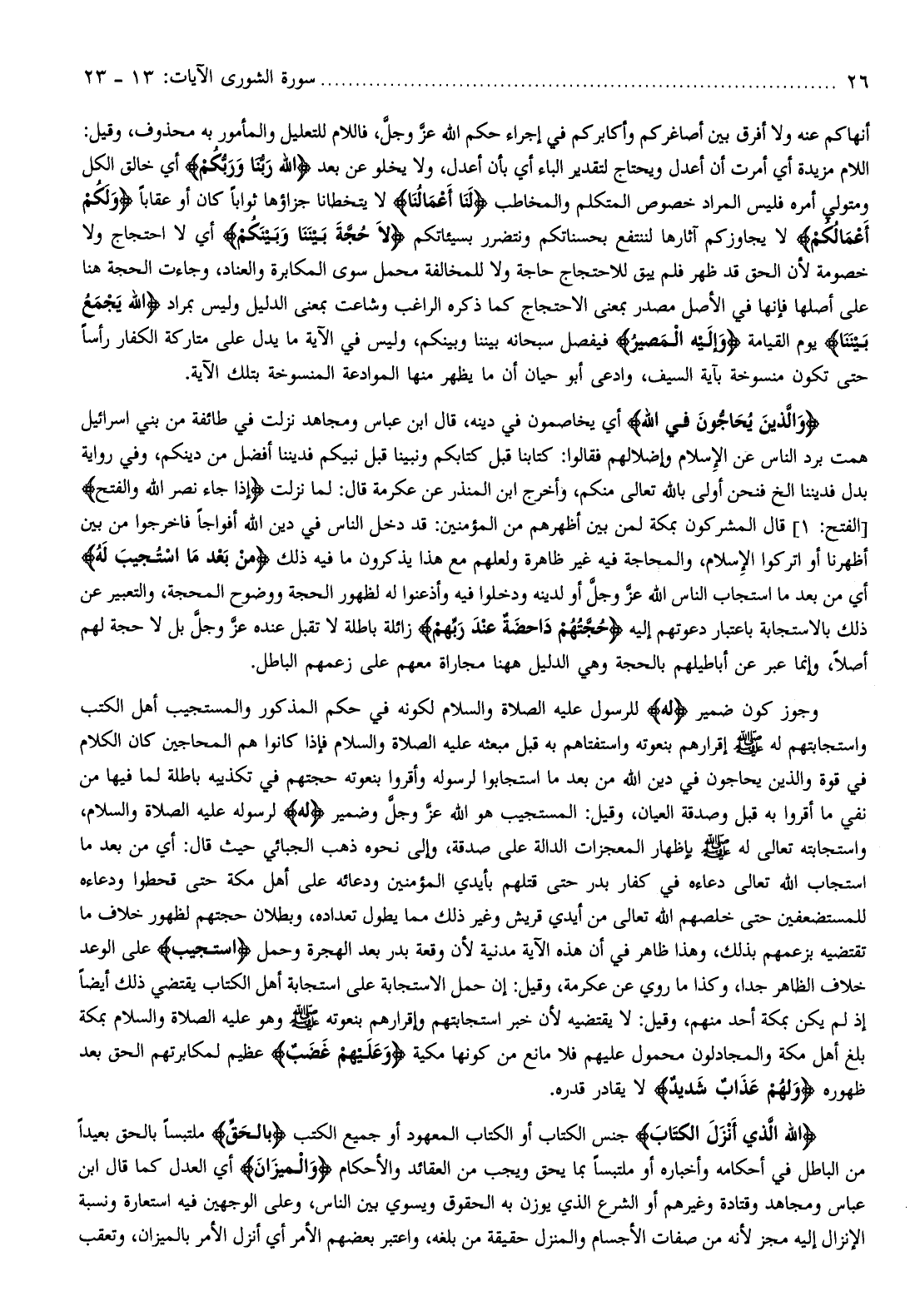 اللام مزيدة أي أمرت أن أعدل ويحتاج لتقدير الباء أي بأن أعدل، ولا يخلو عن بعد اللَّهُ رَبُّنا وَرَبُّكُمْ أي خالق الكل ومتولي أمره فليس المراد خصوص المتكلم والمخاطب لَنا أَعْمالُنا لا يتخطانا جزاؤها ثوابا كان أو عقابا وَلَكُمْ أَعْمالُكُمْ لا يجاوزكم آثارها لننتفع بحسناتكم ونتضرر بسيئاتكم لا حُجَّةَ بَيْنَنا وَبَيْنَكُمُ أي لا احتجاج ولا خصومة لأن الحق قد ظهر فلم يبق للاحتجاج حاجة ولا للمخالفة محمل سوى المكابرة والعناد، وجاءت الحجة هنا على أصلها فإنها في الأصل مصدر بمعنى الاحتجاج كما ذكره الراغب وشاعت بمعنى الدليل وليس بمراد اللَّهُ يَجْمَعُ بَيْنَنا يوم القيامة وَإِلَيْهِ الْمَصِيرُ فيفصل سبحانه بيننا وبينكم، وليس في الآية ما يدل على متاركة الكفار رأسا حتى تكون منسوخة بآية السيف، وادعى أبو حيان أن ما يظهر منها الموادعة المنسوخة بتلك الآية.
