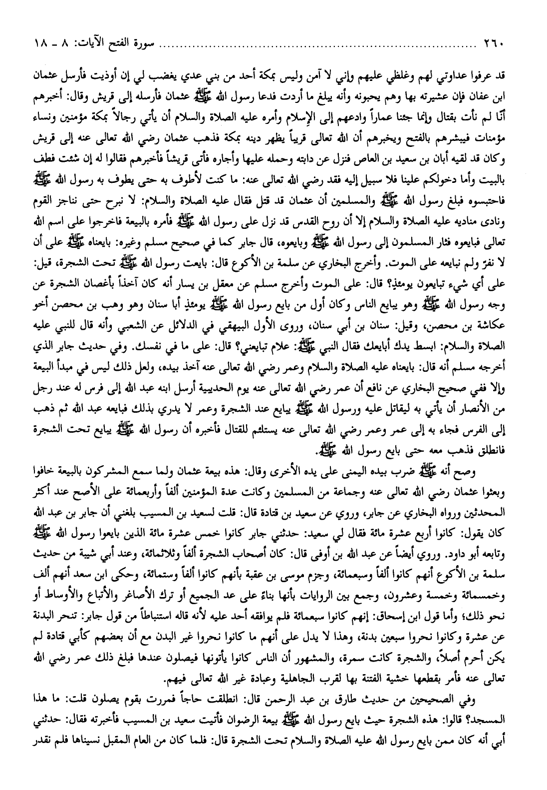 ولما سمع المشركون بالبيعة خافوا وبعثوا عثمان رضي الله تعالى عنه وجماعة من المسلمين وكانت عدة المؤمنين ألفا وأربعمائة على الأصح عند أكثر المحدثين ورواه البخاري عن جابر، وروي عن سعيد بن قتادة قال: قلت لسعيد بن المسيب بلغني أن جابر بن عبد الله كان يقول: كانوا أربع عشرة مائة فقال لي سعيد: حدثني جابر كانوا خمس عشرة مائة الذين بايعوا رسول الله صلّى الله عليه وسلّم وتابعه أبو داود. وروي أيضا عن عبد الله بن أوفى قال: كان أصحاب الشجرة ألفا وثلاثمائة، وعند أبي شيبة من حديث سلمة بن الأكوع أنهم كانوا ألفا وسبعمائة، وجزم موسى بن عقبة بأنهم كانوا ألفا وستمائة، وحكى ابن سعد أنهم ألف وخمسمائة وخمسة وعشرون، وجمع بين الروايات بأنها بناء على عد الجميع أو ترك الأصاغر والأتباع والأوساط أو نحو ذلك وأما قول ابن إسحاق: إنهم كانوا سبعمائة فلم يوافقه أحد عليه لأنه قاله استنباطا من قول جابر: تنحر البدنة عن عشرة وكانوا نحروا سبعين بدنة، وهذا لا يدل على أنهم ما كانوا نحروا غير البدن مع أن بعضهم كأبي قتادة لم يكن أحرم أصلا، والشجرة كانت سمرة، والمشهور أن الناس كانوا يأتونها فيصلون عندها فبلغ ذلك عمر رضي الله تعالى عنه فأمر بقطعها خشية الفتنة بها لقرب الجاهلية وعبادة غير الله تعالى فيهم.
