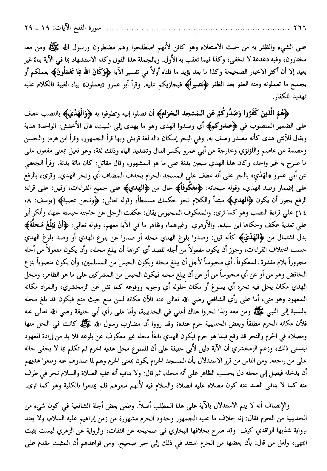 هُمُ الَّذِينَ كَفَرُوا وَصَدُّوكُمْ عَنِ الْمَسْجِدِ الْحَرامِ أن تصلوا إليه وتطوفوا به وَالْهَدْيَ بالنصب عطف على الضمير المنصوب في صَدُّوكُمْ أي وصدوا الهدى وهو ما يهدى إلى البيت، قال الأخفش: الواحدة هدية ويقال للأنثى هدى كأنه مصدر وصف به. وفي البحر إسكان داله لغة قريش وبها قرأ الجمهور، وقرأ ابن هرمز والحسن وعصمة عن عاصم واللؤلؤي وخارجة عن أبي عمرو بكسر الدال وتشديد الياء وذلك لغة، وهو فعيل بمعنى مفعول على ما صرح به غير واحد، وكان هذا الهدي سبعين بدنة على ما هو المشهور، وقال مقاتل: كان مائة بدنة. وقرأ الجعفي عن أبي عمرو «الهدي» بالجر على أنه عطف على المسجد الحرام بحذف المضاف أي ونحر الهدي. وقرىء بالرفع على إضمار وصد الهدي، وقوله سبحانه: مَعْكُوفاً حال من الْهَدْيَ على جميع القراءات، وقيل: على قراءة الرفع يجوز أن يكون الْهَدْيَ مبتدأ والكلام نحو حكمك مسمطا، وقوله تعالى: وَنَحْنُ عُصْبَةٌ [يوسف: 8، 14] علي قراءة النصب وهو كما ترى، والمعكوف المحبوس يقال: عكفت الرجل عن حاجته حبسته عنها، وأنكر أبو علي تعدية عكف وحكاها ابن سيده. والأزهري. وغيرهما، وظاهر ما في الآية معهم، وقوله تعالى: أَنْ يَبْلُغَ مَحِلَّهُ بدل اشتمال من الْهَدْيَ كأنه قيل: وصدوا بلوغ الهدي محله أو صدوا عن بلوغ الهدي أو وصد بلوغ الهدي حسب اختلاف القراءات، وجوز أن يكون مفعولا من أجله للصد أي كراهة أن يبلغ محله، وأن يكون مفعولا من أجله مجرورا بلام مقدرة. لمعكوفا. أي محبوسا لأجل أن يبلغ محله ويكون الحبس من المسلمين، وأن يكون منصوبا بنزع الخافض وهو من أو عن أي محبوسا من أو عن أن يبلغ محله فيكون الحبس من المشركين على ما هو الظاهر، ومحل الهدي مكان يحل فيه نحره أي يسوغ أو مكان حلوله أي وجوبه ووقوعه كما نقل عن الزمخشري، والمراد مكانه المعهود وهو منى، أما على رأي الشافعي رضي الله تعالى عنه فلأن مكانه لمن منع حيث منع فيكون قد بلغ محله بالنسبة إلى النبي صلّى الله عليه وسلّم ومن معه ولذا نحروا هناك أعني في الحديبية، وأما على رأي أبي حنيفة رضي الله تعالى عنه فلأن مكانه الحرم مطلقا وبعض الحديبية حرم عنده وقد رووا أن مضارب رسول الله صلّى الله عليه وسلّم كانت في الحل منها ومصلاه في الحرم والنحر قد وقع فيما هو حرم فيكون الهدي بالغا محله غير معكوف عن بلوغه فلا بد من إرادة المعهود ليتسنى ذلك، وزعم الزمخشري أن الآية دليل لأبي حنيفة على أن الممنوع محل هديه الحرم ثم تكلم بما لا يخفى حاله على من راجعه. ومن الناس من قرر الاستدلال بأن المسجد الحرام يكون بمعنى الحرم وهم لما صدوهم عنه ومنعوا هديهم أن يدخله فيصل إلى محله دل بحسب الظاهر على أنه محله، ثم قال: ولا ينافيه أنه عليه الصلاة والسلام نحر في طرف منه كما لا ينافى الصد عنه كون مصلاه عليه الصلاة والسلام فيه لأنهم منعوهم فلم يمتنعوا بالكلية وهو كما ترى.