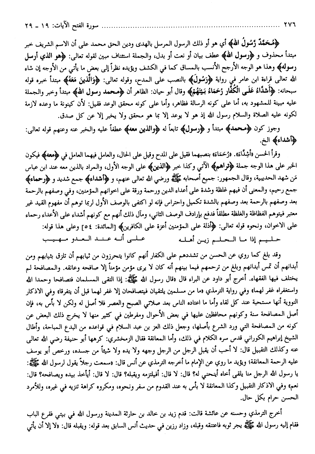 مُحَمَّدٌ رَسُولُ اللَّهِ أي هو أو ذلك الرسول المرسل بالهدى ودين الحق محمد على أن الاسم الشريف خبر مبتدأ محذوف ورَسُولُ اللَّهِ عطف بيان أو نعت أو بدل، والجملة استئناف مبين لقوله تعالى: هُوَ الَّذِي أَرْسَلَ رَسُولَهُ وهذا هو الوجه الأرجح الأنسب بالمساق كما في الكشف ويؤيده نظرا إلى بعض ما يأتي من الأوجه إن شاء الله تعالى قراءة ابن عامر في رواية رَسُولُ بالنصب على المدح، وقوله تعالى: وَالَّذِينَ مَعَهُ مبتدأ خبره قوله سبحانه: أَشِدَّاءُ عَلَى الْكُفَّارِ رُحَماءُ بَيْنَهُمْ وقال أبو حيان: الظاهر أن مُحَمَّدٌ رَسُولُ اللَّهِ مبتدأ وخبر والجملة عليه مبينة للمشهود به، أما على كونه الرسالة فظاهر، وأما على كونه محقق الوعد فقيل: لأن كينونة ما وعده لازمة لكونه عليه الصلاة والسلام رسول الله إذ هو لا يوعد إلا بما هو محقق ولا يخبر إلا عن كل صدق.