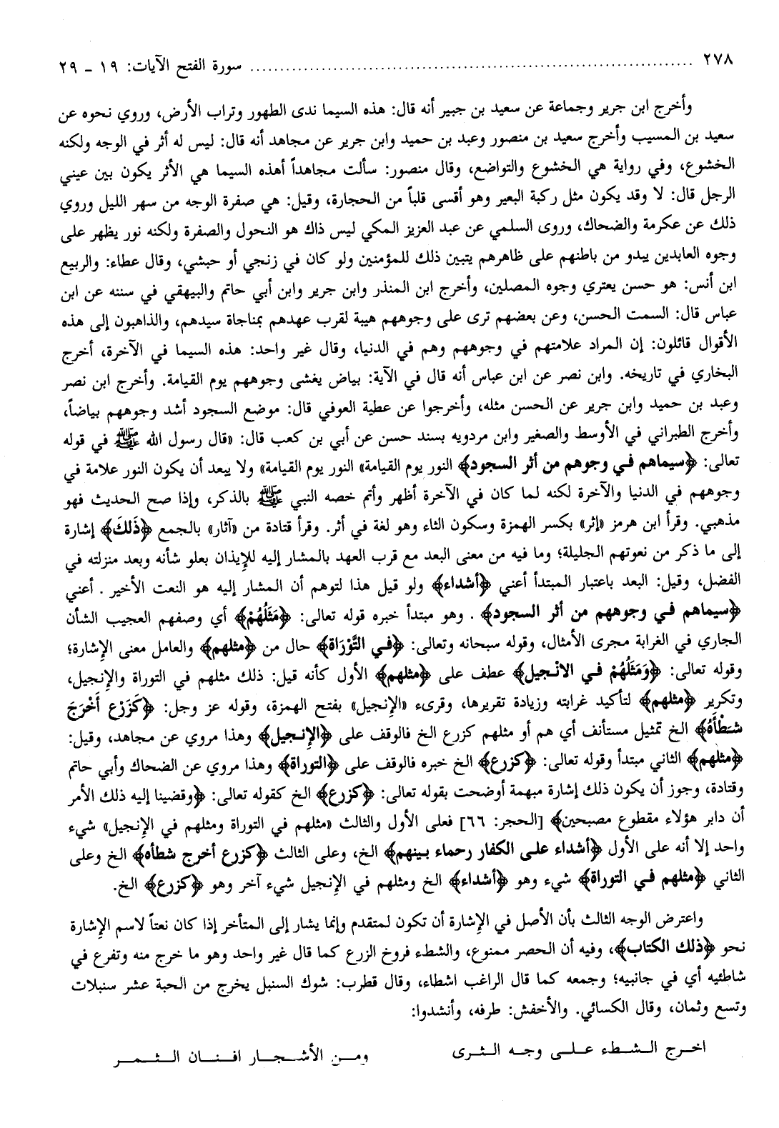 وأخرج الطبراني في الأوسط والصغير وابن مردويه بسند حسن عن أبي بن كعب قال: «قال رسول الله صلّى الله عليه وسلّم في قوله تعالى: سِيماهُمْ فِي وُجُوهِهِمْ مِنْ أَثَرِ السُّجُودِ النور يوم القيامة» النور يوم القيامة»