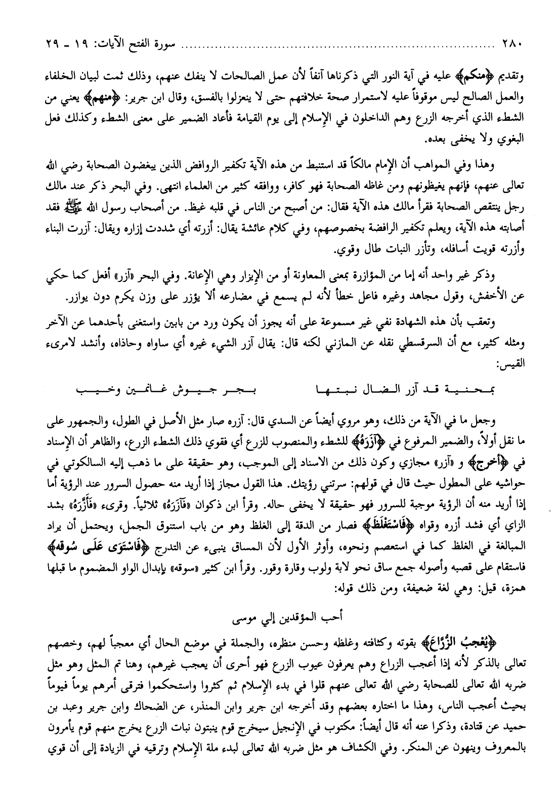 وهذا وفي المواهب أن الإمام مالكا قد استنبط من هذه الآية تكفير الروافض الذين يبغضون الصحابة رضي الله تعالى عنهم، فإنهم يغيظونهم ومن غاظه الصحابة فهو كافر، ووافقه كثير من العلماء انتهى. وفي البحر ذكر عند مالك رجل ينتقص الصحابة فقرأ مالك هذه الآية فقال: من أصبح من الناس في قلبه غيظ. من أصحاب رسول الله صلّى الله عليه وسلّم فقد أصابته هذه الآية، ويعلم تكفير الرافضة بخصوصهم، وفي كلام عائشة يقال: أزرته أي شددت إزاره ويقال: آزرت البناء وأزرته قويت أسافله، وتأزر النبات طال وقوي.