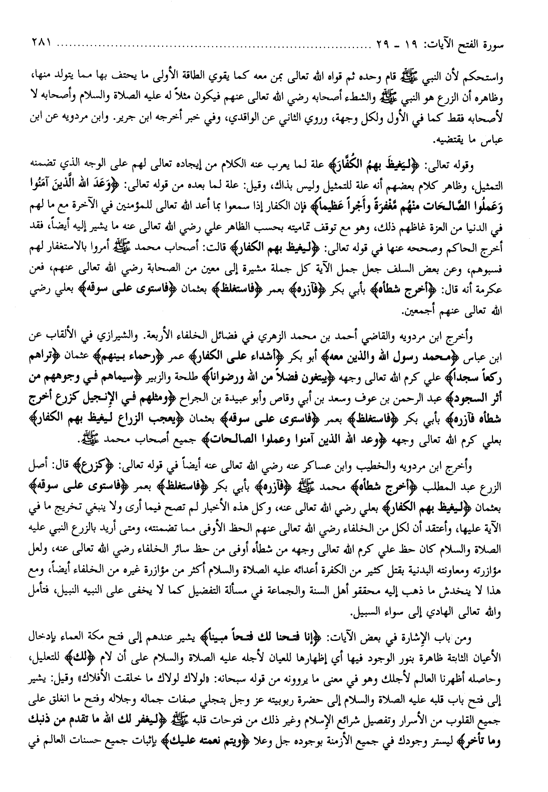 وأخرج ابن مردويه والقاضي أحمد بن محمد الزهري في فضائل الخلفاء الأربعة. والشيرازي في الألقاب عن ابن عباس مُحَمَّدٌ رَسُولُ اللَّهِ وَالَّذِينَ مَعَهُ أبو بكر أَشِدَّاءُ عَلَى الْكُفَّارِ عمر رُحَماءُ بَيْنَهُمْ عثمان تَراهُمْ رُكَّعاً سُجَّداً علي كرم الله تعالى وجهه يَبْتَغُونَ فَضْلًا مِنَ اللَّهِ وَرِضْواناً طلحة والزبير سِيماهُمْ فِي وُجُوهِهِمْ مِنْ أَثَرِ السُّجُودِ عبد الرحمن بن عوف وسعد بن أبي وقاص وأبو عبيدة بن الجراح وَمَثَلُهُمْ فِي الْإِنْجِيلِ كَزَرْعٍ أَخْرَجَ شَطْأَهُ فَآزَرَهُ بأبي بكر فَاسْتَغْلَظَ بعمر فَاسْتَوى عَلى سُوقِهِ بعثمان يُعْجِبُ الزُّرَّاعَ لِيَغِيظَ بِهِمُ الْكُفَّارَ بعلي كرم الله تعالى وجهه وَعَدَ اللَّهُ الَّذِينَ آمَنُوا وَعَمِلُوا الصَّالِحاتِ جميع أصحاب محمد صلّى الله عليه وسلّم.