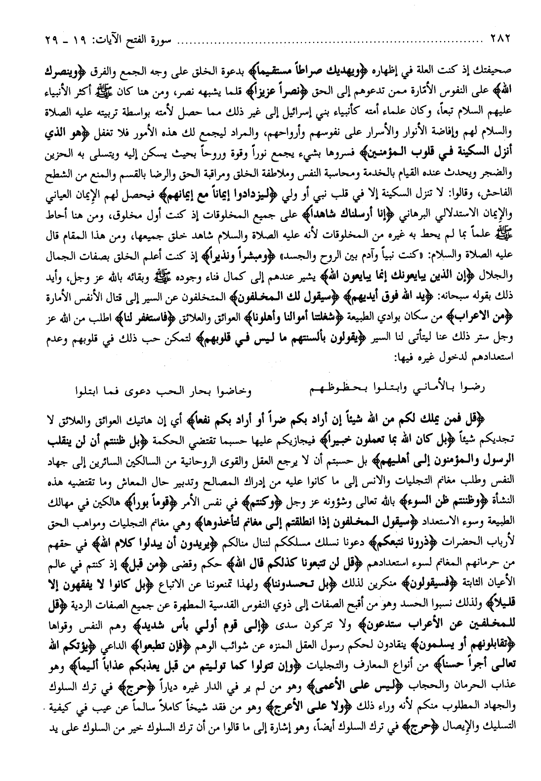 وَمُبَشِّراً وَنَذِيراً إذ كنت أعلم الخلق بصفات الجمال والجلال إِنَّ الَّذِينَ يُبايِعُونَكَ إِنَّما يُبايِعُونَ اللَّهَ يشير عندهم إلى كمال فناء وجوده صلّى الله عليه وسلّم وبقائه بالله عز وجل، وأيد ذلك بقوله سبحانه: يَدُ اللَّهِ فَوْقَ أَيْدِيهِمْ سَيَقُولُ لَكَ الْمُخَلَّفُونَ المتخلفون عن السير إلى قتال الأنفس الأمارة مِنَ الْأَعْرابِ من سكان بوادي الطبيعة شَغَلَتْنا أَمْوالُنا وَأَهْلُونا العوائق والعلائق فَاسْتَغْفِرْ لَنا اطلب من الله عز وجل ستر ذلك عن ليتأتى لنا السير يَقُولُونَ بِأَلْسِنَتِهِمْ ما لَيْسَ فِي قُلُوبِهِمْ لتمكن حب ذلك في قلوبهم وعدم استعدادهم لدخول غيره فيها:
