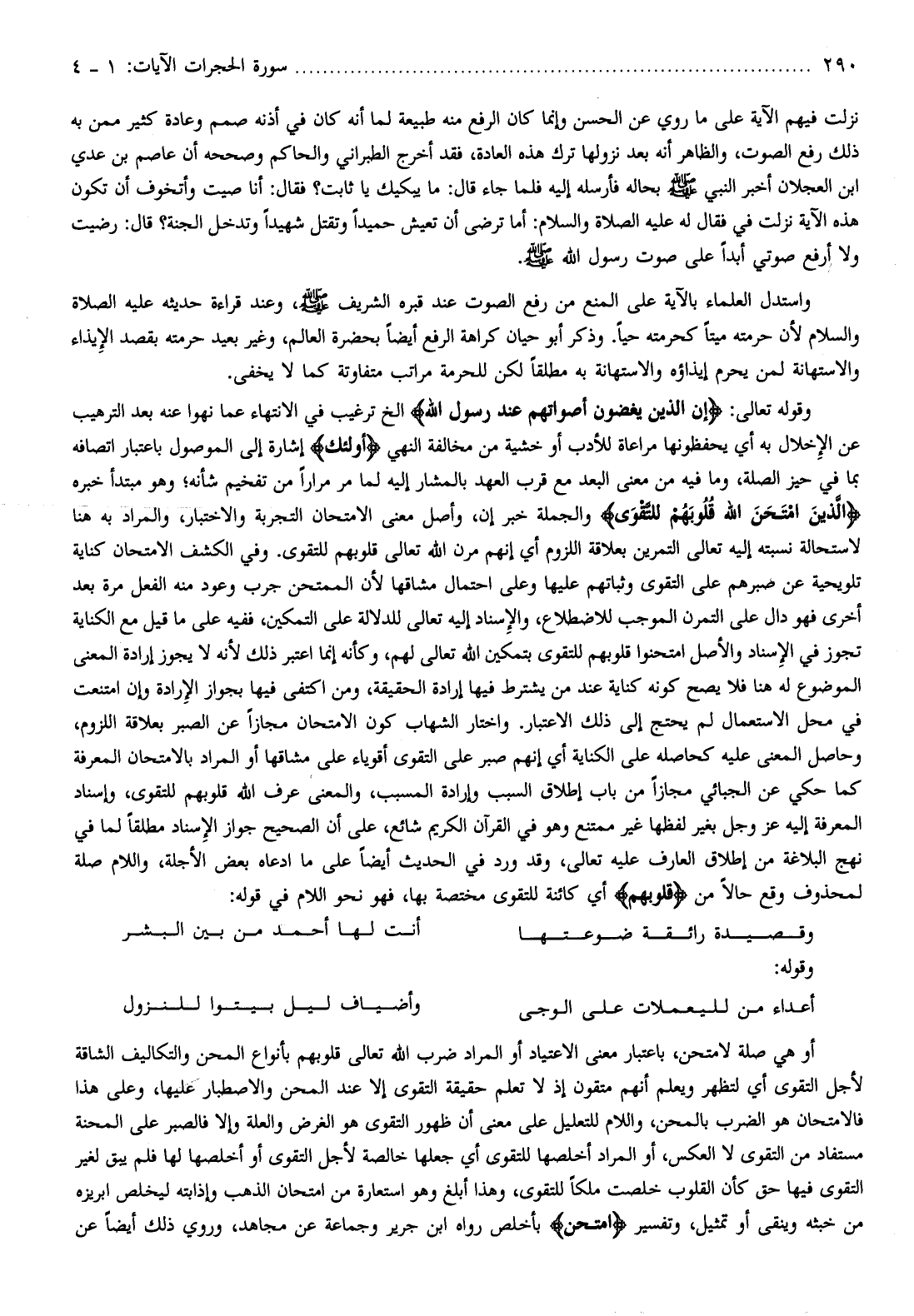 وقوله تعالى: إِنَّ الَّذِينَ يَغُضُّونَ أَصْواتَهُمْ عِنْدَ رَسُولِ اللَّهِ إلخ ترغيب في الانتهاء عما نهوا عنه بعد الترهيب عن الإخلال به أي يحفظونها مراعاة للأدب أو خشية من مخالفة النهي أُولئِكَ إشارة إلى الموصول باعتبار اتصافه بما في حيز الصلة، وما فيه من معنى البعد مع قرب العهد بالمشار إليه لما مر مرارا من تفخيم شأنه وهو مبتدأ خبره الَّذِينَ امْتَحَنَ اللَّهُ قُلُوبَهُمْ لِلتَّقْوى والجملة خبر إن، وأصل معنى الامتحان التجربة والاختبار، والمراد به هنا لاستحالة نسبته إليه تعالى التمرين بعلاقة اللزوم أي إنهم مرن الله تعالى قلوبهم للتقوى. وفي الكشف الامتحان كناية تلويحية عن صبرهم على التقوى وثباتهم عليها وعلى احتمال مشاقها لأن الممتحن جرب وعود منه الفعل مرة بعد أخرى فهو دال على التمرن الموجب للاضطلاع، والإسناد إليه تعالى للدلالة على التمكين، ففيه على ما قيل مع الكناية تجوز في الإسناد والأصل امتحنوا قلوبهم للتقوى بتمكين الله تعالى لهم، وكأنه إنما اعتبر ذلك لأنه لا يجوز إرادة المعنى الموضوع له هنا فلا يصح كونه كناية عند من يشترط فيها إرادة الحقيقة، ومن اكتفى فيها بجواز الإرادة وإن امتنعت في محل الاستعمال لم يحتج إلى ذلك الاعتبار. واختار الشهاب كون الامتحان مجازا عن الصبر بعلاقة اللزوم، وحاصل المعنى عليه كحاصله على الكناية أي إنهم صبر على التقوى أقوياء على مشاقها أو المراد بالامتحان المعرفة كما حكي عن الجبائي مجازا من باب إطلاق السبب وإرادة المسبب، والمعنى عرف الله قلوبهم للتقوى، وإسناد المعرفة إليه عز وجل بغير لفظها غير ممتنع وهو في القرآن الكريم شائع، على أن الصحيح جواز الإسناد مطلقا لما في نهج البلاغة من إطلاق العارف عليه تعالى، وقد ورد في الحديث أيضا على ما ادعاه بعض الأجلة، واللام صلة لمحذوف وقع حالا من قُلُوبَهُمْ أي كائنة للتقوى مختصة بها، فهو نحو اللام في قوله: