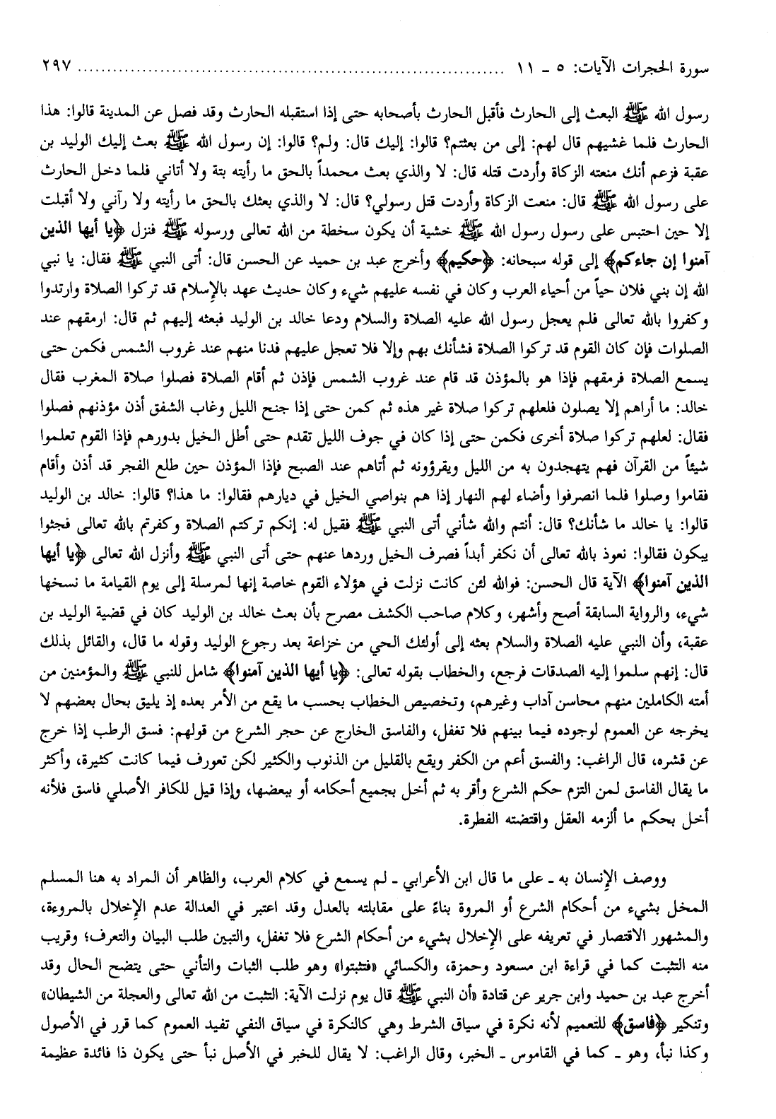 رسول الله صلّى الله عليه وسلّم البعث إلى الحارث فأقبل الحارث بأصحابه حتى إذا استقبله الحارث وقد فصل عن المدينة قالوا: هذا الحارث فلما غشيهم قال لهم: إلى من بعثتم؟ قالوا: إليك قال: ولم؟ قالوا: إن رسول الله صلّى الله عليه وسلّم بعث إليك الوليد بن عقبة فزعم أنك منعته الزكاة وأردت قتله قال: لا والذي بعث محمدا بالحق ما رأيته بتة ولا أتاني فلما دخل الحارث على رسول الله صلّى الله عليه وسلّم قال: منعت الزكاة وأردت قتل رسولي؟ قال: لا والذي بعثك بالحق ما رأيته ولا رآني ولا أقبلت إلا حين احتبس على رسول الله صلّى الله عليه وسلّم خشية أن يكون سخطة من الله تعالى ورسوله صلّى الله عليه وسلّم فنزل يا أَيُّهَا الَّذِينَ آمَنُوا إِنْ جاءَكُمْ إلى قوله سبحانه: حَكِيمٌ