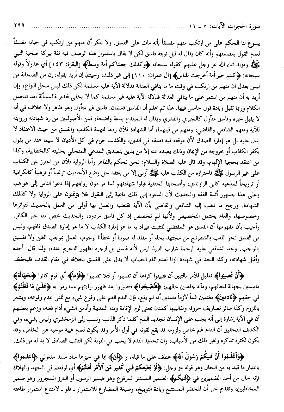 يسوغ لنا الحكم على من ارتكب منهم مفسقا بأنه مات على الفسق. ولا ننكر أن منهم من ارتكب في حياته مفسقا لعدم القول بعصمتهم وأنه كان يقال له قبل توبته فاسق لكن لا يقال باستمرار هذا الوصف فيه ثقة ببركة صحبة النبي صلّى الله عليه وسلّم ومزيد ثناء الله عز وجل عليهم كقوله سبحانه وَكَذلِكَ جَعَلْناكُمْ أُمَّةً وَسَطاً [البقرة: 143] أي عدولا وقوله سبحانه: كُنْتُمْ خَيْرَ أُمَّةٍ أُخْرِجَتْ لِلنَّاسِ [آل عمران: 110] إلى غير ذلك، وحينئذ إن أريد بقوله: إن من الصحابة من ليس بعدل ان منهم من ارتكب في وقت ما ما ينافي العدالة فدلالة الآية عليه مسلمة لكن ذلك ليس محل النزاع، وإن أريد به أن منهم من استمر على ما ينافي العدالة فدلالة الآية عليه غير مسلمة كما لا يخفى فتدبر فالمسألة بعد تتحمل الكلام وربما تقبل زيادة قول خامس فيها. هذا ثم اعلم أن الفاسق قسمان: فاسق غير متأول وهو ظاهر ولا خلاف في أنه لا يقبل خبره وفاسق متأول كالجبري والقدري ويقال له المبتدع بدعة واضحة، فمن الأصوليين من رد شهادته وروايته للآية ومنهم الشافعي والقاضي، ومنهم من قبلهما، أما الشهادة فلأن ردها لتهمة الكذب والفسق من حيث الاعتقاد لا يدل عليه بل هو إمارة الصدق لأن موقعه فيه تعمقه في الدين، والكذب حرام في كل الأديان لا سيما عند من يقول بكفر الكاذب أو خروجه من الإيمان وذلك يصده عنه إلا من يدين بتصديق المدعي المتحلي بحليته كالخطابية، وكذا من اعتقد بحجية الإلهام،