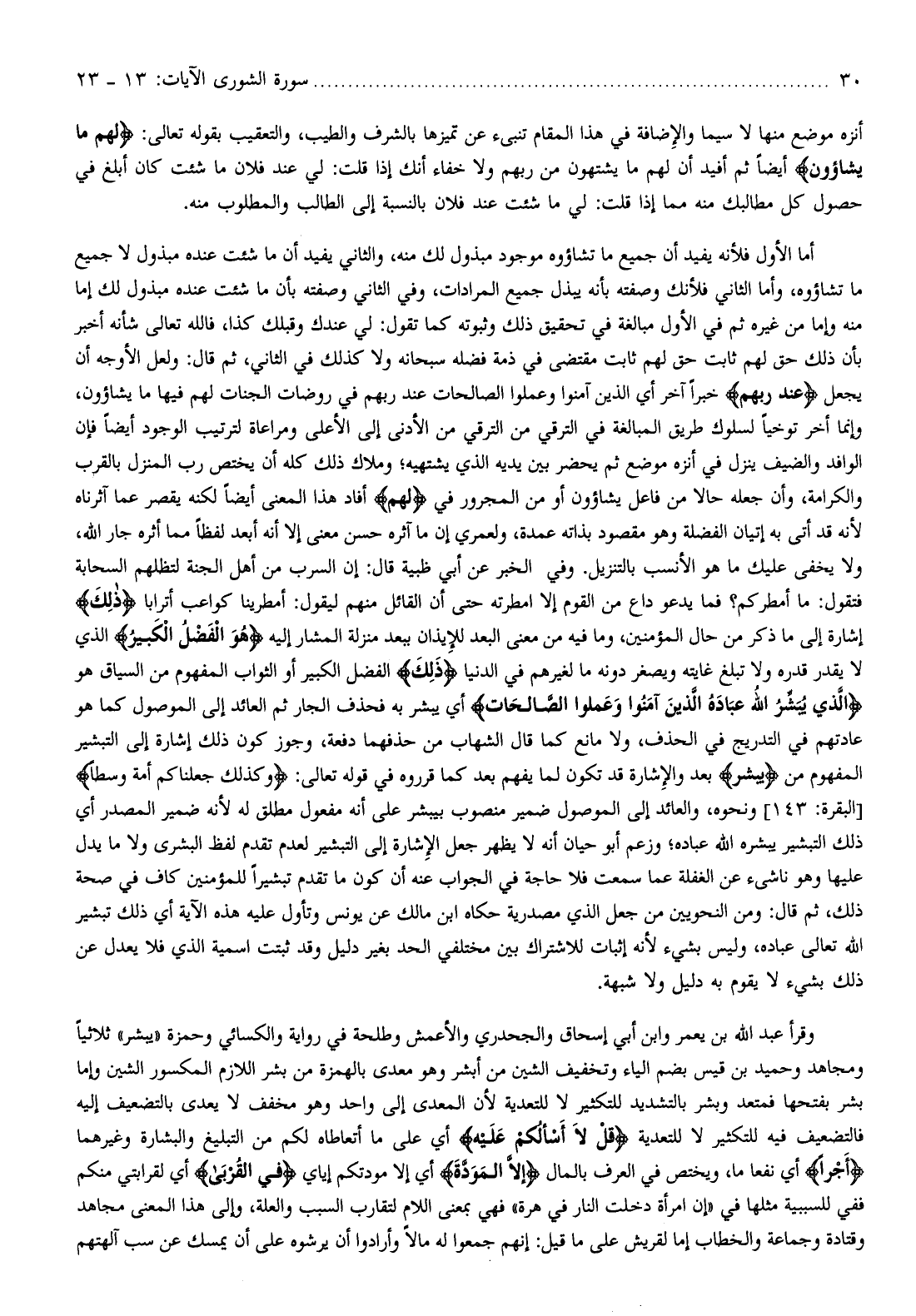 وقرأ عبد الله بن يعمر وابن أبي إسحاق والجحدري والأعمش وطلحة في رواية والكسائي وحمزة «يبشر» ثلاثيا ومجاهد وحميد بن قيس بضم الياء وتخفيف الشين من أبشر وهو معدى بالهمزة من بشر اللازم المكسور الشين وإما بشر بفتحها فمتعد وبشر بالتشديد للتكثير لا للتعدية لأن المعدى إلى واحد وهو مخفف لا يعدى بالتضعيف إليه فالتضعيف فيه للتكثير لا للتعدية قُلْ لا أَسْئَلُكُمْ عَلَيْهِ أي على ما أتعاطاه لكم من التبليغ والبشارة وغيرهما أَجْراً أي نفعا ما، ويختص في العرف بالمال إِلَّا الْمَوَدَّةَ أي إلا مودتكم إياي فِي الْقُرْبى أي لقرابتي منكم ففي للسببية مثلها في «إن امرأة دخلت النار في هرة» فهي بمعنى اللام لتقارب السبب والعلة، وإلى هذا المعنى مجاهد وقتادة وجماعة والخطاب إما لقريش على ما قيل: إنهم جمعوا له مالا وأرادوا أن يرشوه على أن يمسك عن سب آلهتهم