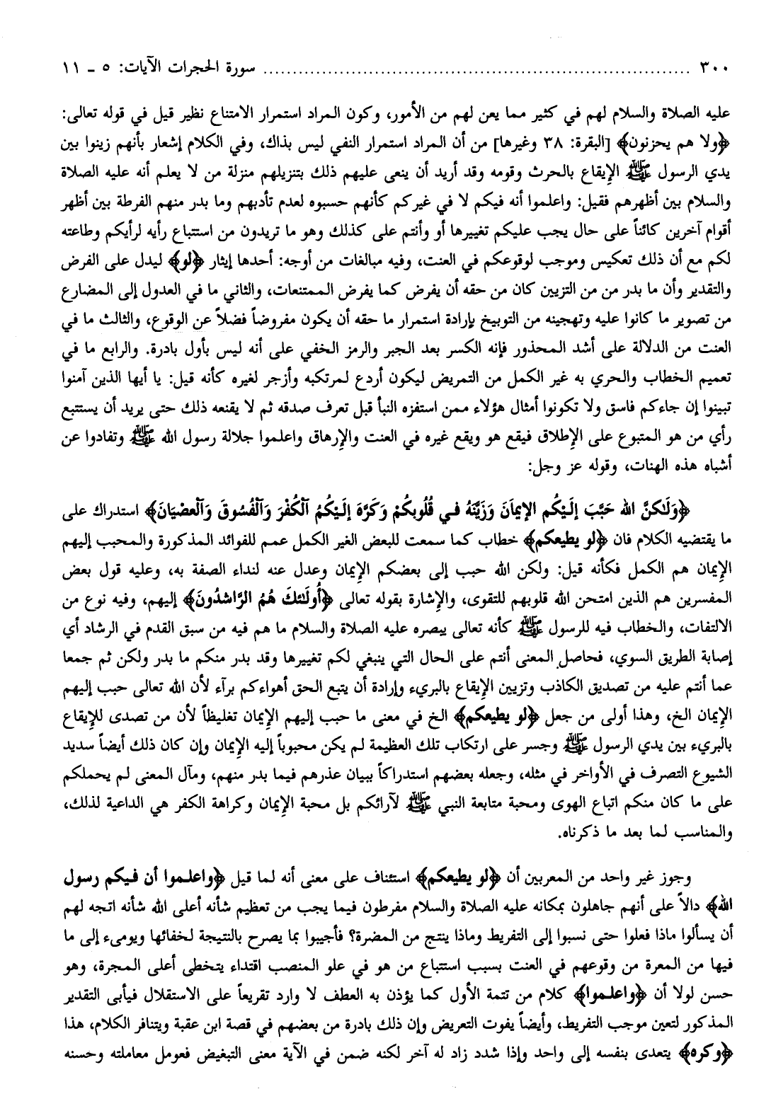 وَلا هُمْ يَحْزَنُونَ [البقرة: 38 وغيرها] من أن المراد استمرار النفي ليس بذاك، وفي الكلام إشعار بأنهم زينوا بين يدي الرسول صلّى الله عليه وسلّم الإيقاع بالحرث وقومه وقد أريد أن ينعى عليهم ذلك بتنزيلهم منزلة من لا يعلم أنه عليه الصلاة والسلام بين أظهرهم فقيل: واعلموا أنه فيكم لا في غيركم كأنهم حسبوه لعدم تأدبهم وما بدر منهم الفرطة بين أظهر أقوام آخرين كائنا على حال يجب عليكم تغييرها أو وأنتم على كذلك وهو ما تريدون من استتباع رأيه لرأيكم وطاعته لكم مع أن ذلك تعكيس وموجب لوقوعكم في العنت، وفيه مبالغات من أوجه: أحدها إيثار لَوْ ليدل على الفرض والتقدير وأن ما بدر من من التزيين كان من حقه أن يفرض كما يفرض الممتنعات، والثاني ما في العدول إلى المضارع من تصوير ما كانوا عليه وتهجينه من التوبيخ بإرادة استمرار ما حقه أن يكون مفروضا فضلا عن الوقوع، والثالث ما في العنت من الدلالة على أشد المحذور فإنه الكسر بعد الجبر والرمز الخفي على أنه ليس بأول بادرة. والرابع ما في تعميم الخطاب والحري به غير الكمل من التمريض ليكون أردع لمرتكبه وأزجر لغيره كأنه قيل: يا أيها الذين آمنوا تبينوا إن جاءكم فاسق ولا تكونوا أمثال هؤلاء ممن استفزه النبأ قبل تعرف صدقه ثم لا يقنعه ذلك حتى يريد أن يستتبع رأي من هو المتبوع على الإطلاق فيقع هو ويقع غيره في العنت والإرهاق واعلموا جلالة رسول الله صلّى الله عليه وسلّم وتفادوا عن أشباه هذه الهنات، وقوله عز وجل: