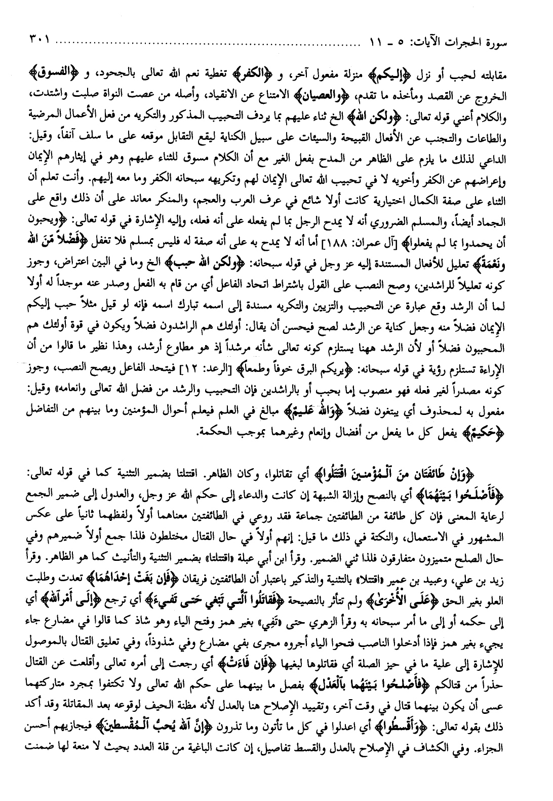 فَأَصْلِحُوا بَيْنَهُما أي بالنصح وإزالة الشبهة إن كانت والدعاء إلى حكم الله عز وجل، والعدول إلى ضمير الجمع لرعاية المعنى فإن كل طائفة من الطائفتين جماعة فقد روعي في الطائفتين معناهما أولا ولفظهما ثانيا على عكس المشهور في الاستعمال، والنكتة في ذلك ما قيل: إنهم أولا في حال القتال مختلطون فلذا جمع أولا ضميرهم وفي حال الصلح متميزون متفارقون فلذا ثني الضمير. وقرأ ابن أبي عبلة «اقتتلتا» بضمير التثنية والتأنيث كما هو الظاهر. وقرأ زيد بن علي، وعبيد بن عمير «اقتتلا» بالتثنية والتذكير باعتبار أن الطائفتين فريقان فَإِنْ بَغَتْ إِحْداهُما تعدت وطلبت العلو بغير الحق عَلَى الْأُخْرى ولم تتأثر بالنصيحة فَقاتِلُوا الَّتِي تَبْغِي حَتَّى تَفِيءَ أي ترجع إِلى أَمْرِ اللَّهِ أي إلى حكمه أو إلى ما أمر سبحانه به وقرأ الزهري حتى «تفي» بغير همز وفتح الياء وهو شاذ كما قالوا في مضارع جاء يجيء بغير همز فإذا أدخلوا الناصب فتحوا الياء أجروه مجرى بفي مضارع وفي شذوذا، وفي تعليق القتال بالموصول للإشارة إلى علية ما في حيز الصلة أي فقاتلوها لبغيها فَإِنْ فاءَتْ أي رجعت إلى أمره تعالى وأقلعت عن القتال حذرا من قتالكم فَأَصْلِحُوا بَيْنَهُما بِالْعَدْلِ بفصل ما بينهما على حكم الله تعالى ولا تكتفوا بمجرد متاركتهما عسى أن يكون بينهما قتال في وقت آخر، وتقييد الإصلاح هنا بالعدل لأنه مظنة الحيف لوقوعه بعد المقاتلة وقد أكد ذلك بقوله تعالى: وَأَقْسِطُوا أي اعدلوا في كل ما تأتون وما تذرون إِنَّ اللَّهَ يُحِبُّ الْمُقْسِطِينَ فيجازيهم أحسن الجزاء. وفي الكشاف في الإصلاح بالعدل والقسط تفاصيل، إن كانت الباغية من قلة العدد بحيث لا منعة لها ضمنت