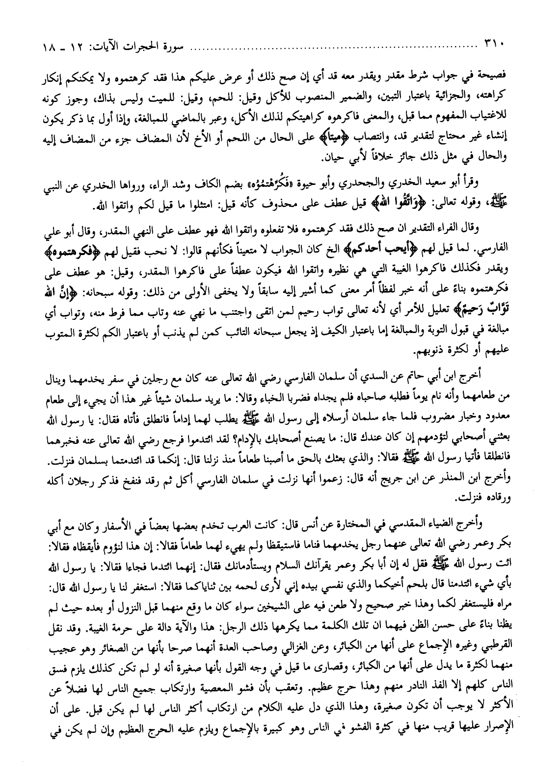 وهذا خبر صحيح ولا طعن فيه على الشيخين سواء كان ما وقع منهما قبل النزول أو بعده حيث لم يظنا بناء على حسن الظن فيهما ان تلك الكلمة مما يكرهها ذلك الرجل: هذا والآية دالة على حرمة الغيبة. وقد نقل القرطبي وغيره الإجماع على أنها من الكبائر، وعن الغزالي وصاحب العدة أنهما صرحا بأنها من الصغائر وهو عجيب منهما لكثرة ما يدل على أنها من الكبائر، وقصارى ما قيل في وجه القول بأنها صغيرة أنه لو لم تكن كذلك يلزم فسق الناس كلهم إلا الفذ النادر منهم وهذا حرج عظيم. وتعقب بأن فشو المعصية وارتكاب جميع الناس لها فضلا عن الأكثر لا يوجب أن تكون صغيرة، وهذا الذي دل عليه الكلام من ارتكاب أكثر الناس لها لم يكن قبل. على أن الإصرار عليها قريب منها في كثرة الفشو في الناس وهو كبيرة بالإجماع ويلزم عليه الحرج العظيم وإن لم يكن في