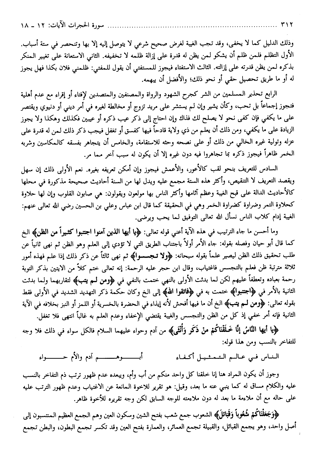 وَجَعَلْناكُمْ شُعُوباً وَقَبائِلَ الشعوب جمع شعب بفتح الشين وسكون العين وهم الجمع العظيم المنتسبون إلى أصل واحد، وهو يجمع القبائل، والقبيلة تجمع العمائر، والعمارة بفتح العين وقد تكسر تجمع البطون، والبطن تجمع