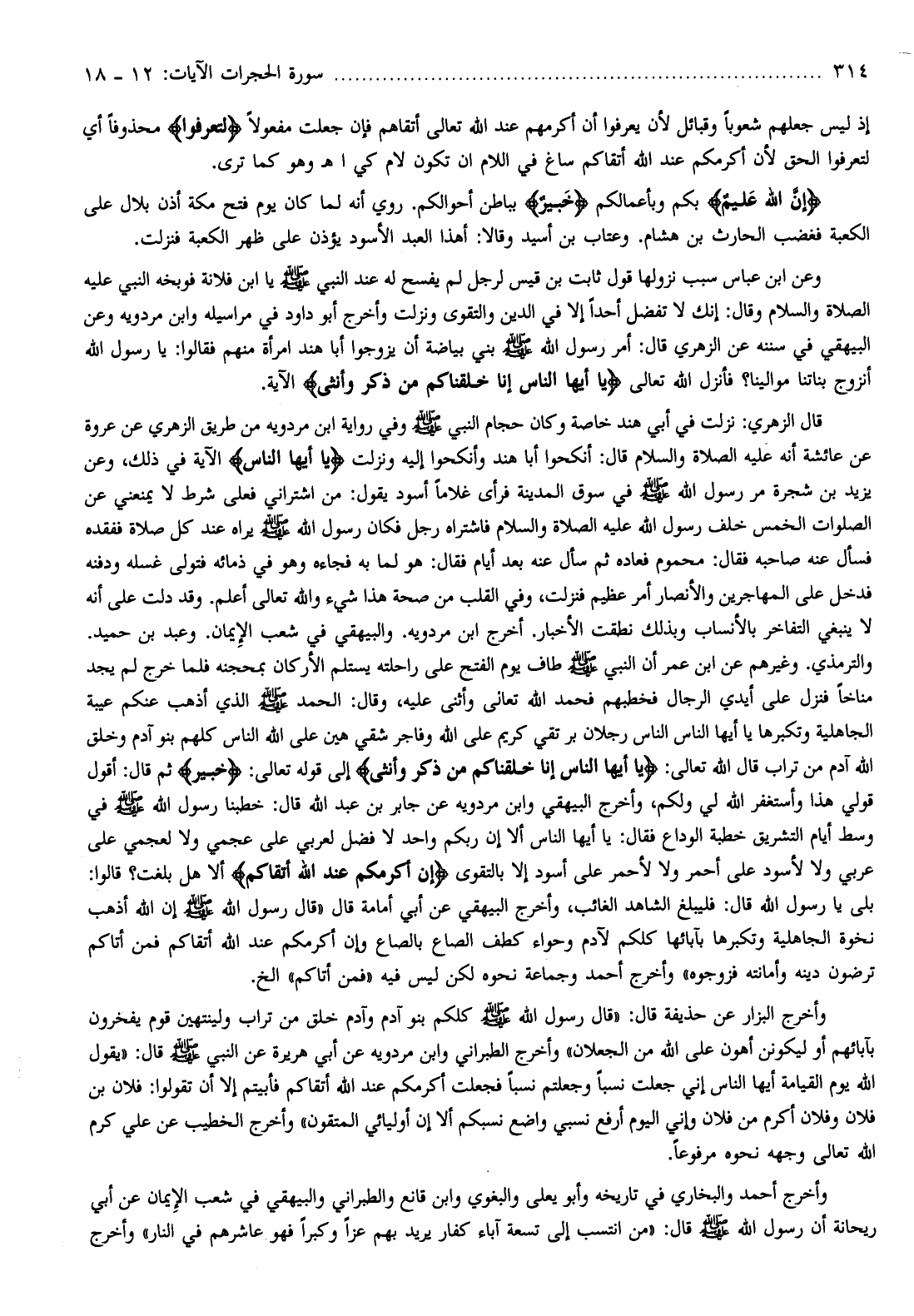 وأخرج الطبراني وابن مردويه عن أبي هريرة عن النبي صلّى الله عليه وسلّم قال: «يقول الله يوم القيامة أيها الناس إني جعلت نسبا وجعلتم نسبا فجعلت أكرمكم عند الله أتقاكم فأبيتم إلا أن تقولوا: فلان بن فلان وفلان أكرم من فلان وإني اليوم أرفع نسبي واضع نسبكم ألا إن أوليائي المتقون» وأخرج الخطيب عن علي كرم الله تعالى وجهه نحوه مرفوعا.