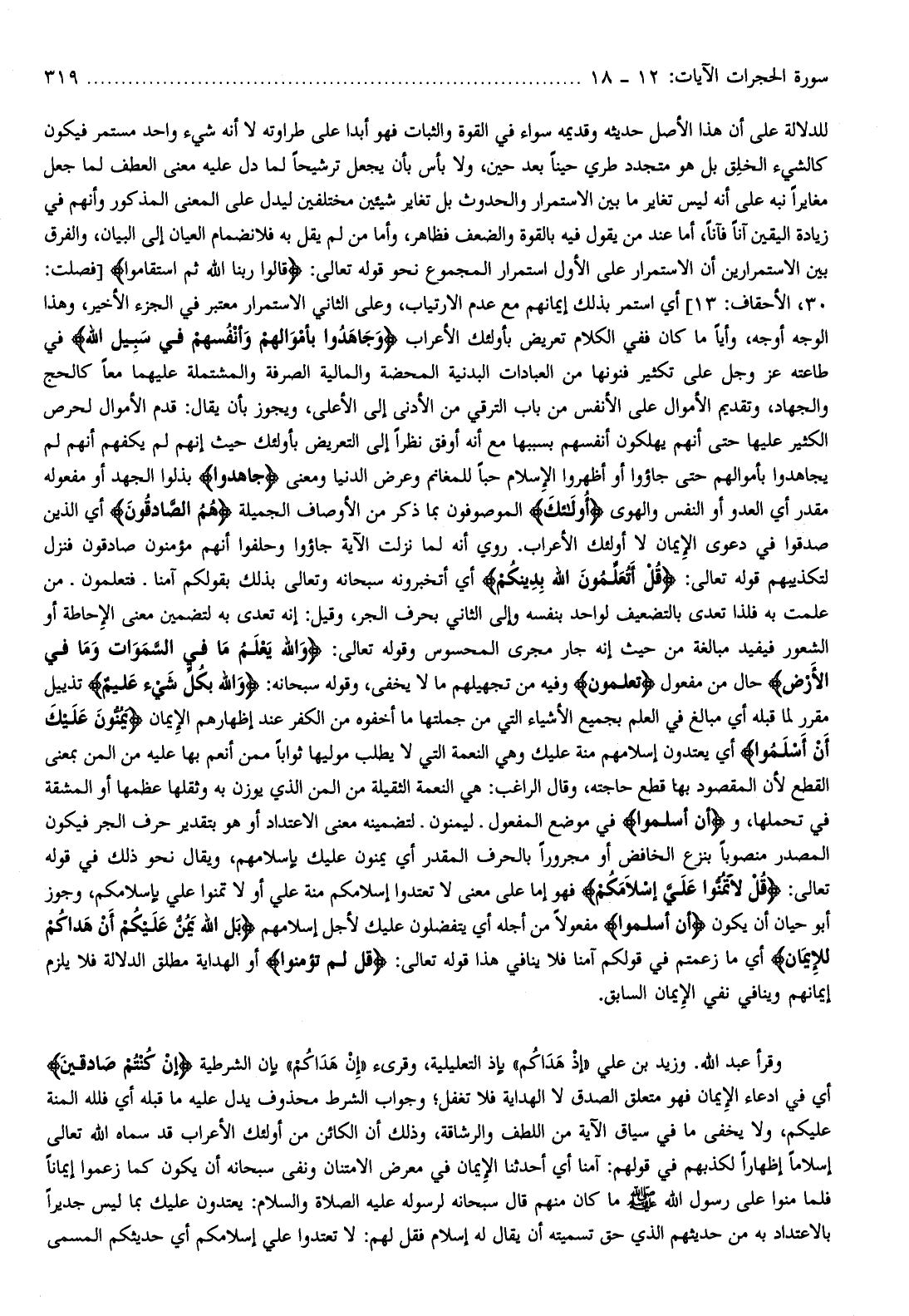 30، الأحقاف: 13] أي استمر بذلك إيمانهم مع عدم الارتياب، وعلى الثاني الاستمرار معتبر في الجزء الأخير، وهذا الوجه أوجه، وأيا ما كان ففي الكلام تعريض بأولئك الأعراب وَجاهَدُوا بِأَمْوالِهِمْ وَأَنْفُسِهِمْ فِي سَبِيلِ اللَّهِ في طاعته عز وجل على تكثير فنونها من العبادات البدنية المحضة والمالية الصرفة والمشتملة عليهما معا كالحج والجهاد، وتقديم الأموال على الأنفس من باب الترقي من الأدنى إلى الأعلى، ويجوز بأن يقال: قدم الأموال لحرص الكثير عليها حتى أنهم يهلكون أنفسهم بسببها مع أنه أوفق نظرا إلى التعريض بأولئك حيث إنهم لم يكفهم أنهم لم يجاهدوا بأموالهم حتى جاؤوا أو أظهروا الإسلام حبا للمغانم وعرض الدنيا ومعنى جاهَدُوا بذلوا الجهد أو مفعوله مقدر أي العدو أو النفس والهوى أُولئِكَ الموصوفون بما ذكر من الأوصاف الجميلة هُمُ الصَّادِقُونَ أي الذين صدقوا في دعوى الإيمان لا أولئك الأعراب. روي أنه لما نزلت الآية جاؤوا وحلفوا أنهم مؤمنون صادقون فنزل لتكذيبهم قوله تعالى: قُلْ أَتُعَلِّمُونَ اللَّهَ بِدِينِكُمْ أي أتخبرونه سبحانه وتعالى بذلك بقولكم آمنا. فتعلمون. من علمت به فلذا تعدى بالتضعيف لواحد بنفسه وإلى الثاني بحرف الجر، وقيل: إنه تعدى به لتضمين معنى الإحاطة أو الشعور فيفيد مبالغة من حيث إنه جار مجرى المحسوس وقوله تعالى: وَاللَّهُ يَعْلَمُ ما فِي السَّماواتِ وَما فِي الْأَرْضِ حال من مفعول تُعَلِّمُونَ وفيه من تجهيلهم ما لا يخفى، وقوله سبحانه: وَاللَّهُ بِكُلِّ شَيْءٍ عَلِيمٌ تذييل مقرر لما قبله أي مبالغ في العلم بجميع الأشياء التي من جملتها ما أخفوه من الكفر عند إظهارهم الإيمان يَمُنُّونَ عَلَيْكَ أَنْ أَسْلَمُوا أي يعتدون إسلامهم منة عليك وهي النعمة التي لا يطلب موليها ثوابا ممن أنعم بها عليه من المن بمعنى القطع لأن المقصود بها قطع حاجته، وقال الراغب: هي النعمة الثقيلة من المن الذي يوزن به وثقلها عظمها أو المشقة في تحملها، وأَنْ أَسْلَمُوا في موضع المفعول. ليمنون. لتضمينه معنى الاعتداد أو هو بتقدير حرف الجر فيكون المصدر منصوبا بنزع الخافض أو مجرورا بالحرف المقدر أي يمنون عليك بإسلامهم، ويقال نحو ذلك في قوله تعالى: قُلْ لا تَمُنُّوا عَلَيَّ إِسْلامَكُمْ فهو إما على معنى لا تعتدوا إسلامكم منة علي أو لا تمنوا علي بإسلامكم، وجوز أبو حيان أن يكون أَنْ أَسْلَمُوا مفعولا من أجله أي يتفضلون عليك لأجل إسلامهم بَلِ اللَّهُ يَمُنُّ عَلَيْكُمْ أَنْ هَداكُمْ لِلْإِيمانِ أي ما زعمتم في قولكم آمنا فلا ينافي هذا قوله تعالى: قُلْ لَمْ تُؤْمِنُوا أو الهداية مطلق الدلالة فلا يلزم إيمانهم وينافي نفي الإيمان السابق.