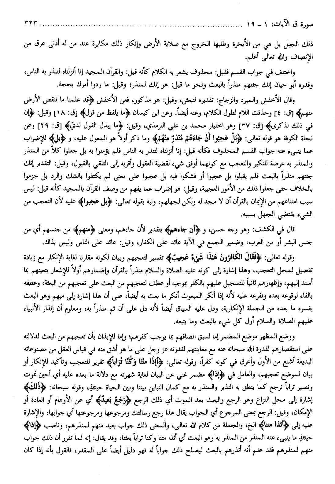 وقال الأخفش والمبرد والزجاج: تقديره لتبعثن، وقيل: هو مذكور، فعن الأخفش قَدْ عَلِمْنا ما تَنْقُصُ الْأَرْضُ مِنْهُمْ [ق: 4] وحذفت اللام لطول الكلام، وعنه أيضا. وعن ابن كيسان ما يَلْفِظُ مِنْ قَوْلٍ [ق: 18] وقيل: إِنَّ فِي ذلِكَ لَذِكْرى [ق: 37] وهو اختيار محمد بن علي الترمذي، وقيل: ما يُبَدَّلُ الْقَوْلُ لَدَيَّ [ق: 29] وعن نحاة الكوفة هو قوله تعالى: بَلْ عَجِبُوا أَنْ جاءَهُمْ مُنْذِرٌ مِنْهُمْ وما ذكر أولا هو المعول عليه، وبَلْ للإضراب عما ينبىء عنه جواب القسم المحذوف فكأنه قيل: إنا أنزلناه لتنذر به الناس فلم يؤمنوا به بل جعلوا كلا من المنذر والمنذر به عرضة للتكبر والتعجب مع كونهما أوفق شيء لقضية العقول وأقربه إلى التلقي بالقبول، وقيل: التقدير إنك جئتهم منذرا بالبعث فلم يقبلوا بل عجبوا أو فشكوا فيه بل عجبوا على معنى لم يكتفوا بالشك والرد بل جزموا بالخلاف حتى جعلوا ذلك من الأمور العجيبة، وقيل: هو إضراب عما يفهم من وصف القرآن بالمجيد كأنه قيل: ليس سبب امتناعهم من الإيمان بالقرآن أن لا مجد له ولكن لجهلهم، ونبه بقوله تعالى: بَلْ عَجِبُوا عليه لأن التعجب من الشيء يقتضي الجهل بسببه.