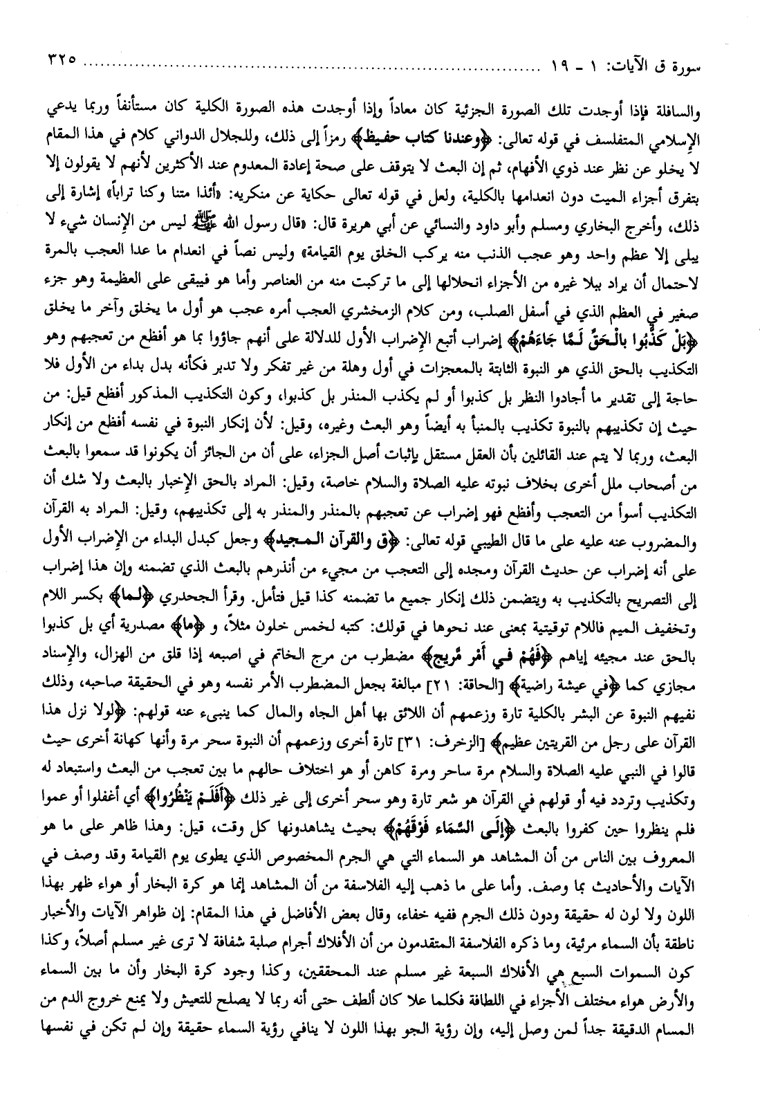 والسافلة فإذا أوجدت تلك الصورة الجزئية كان معادا وإذا أوجدت هذه الصورة الكلية كان مستأنفا وربما يدعي الإسلامي المتفلسف في قوله تعالى: وَعِنْدَنا كِتابٌ حَفِيظٌ رمزا إلى ذلك، وللجلال الدواني كلام في هذا المقام لا يخلو عن نظر عند ذوي الأفهام، ثم إن البعث لا يتوقف على صحة إعادة المعدوم عند الأكثرين لأنهم لا يقولون إلا بتفرق أجزاء الميت دون انعدامها بالكلية، ولعل في قوله تعالى حكاية عن منكريه: «أئذا متنا وكنا ترابا» إشارة إلى ذلك،