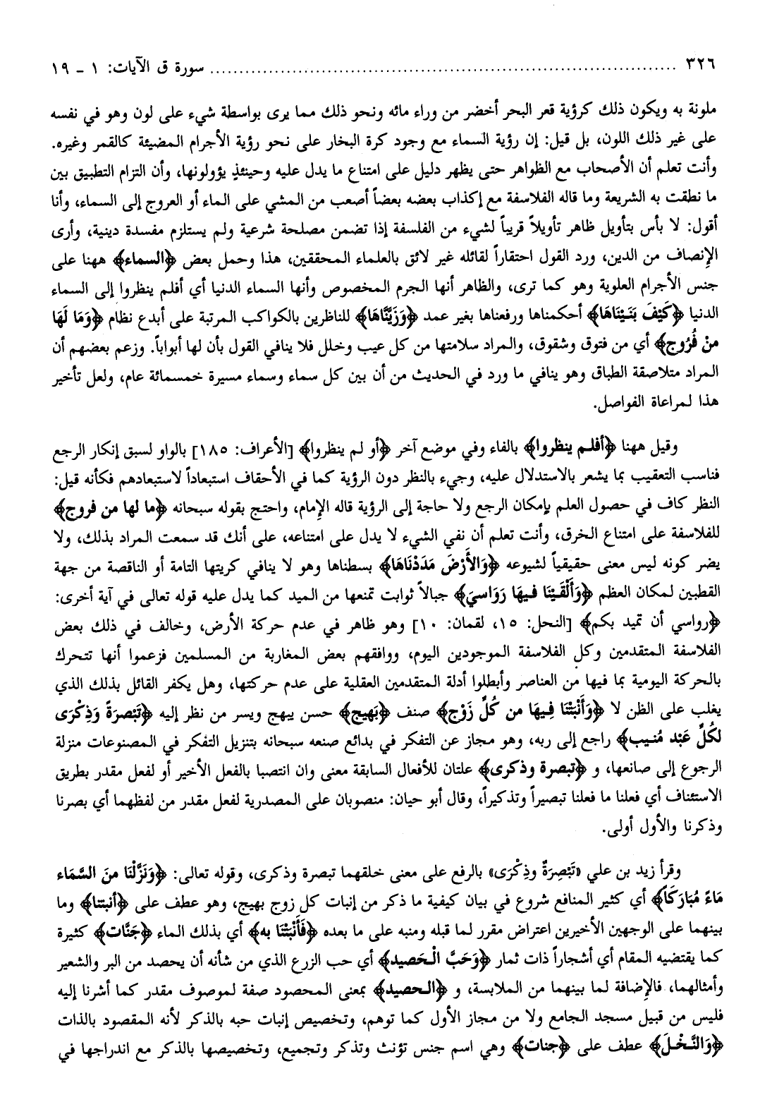 رَواسِيَ أَنْ تَمِيدَ بِكُمْ [النحل: 15، لقمان: 10] وهو ظاهر في عدم حركة الأرض، وخالف في ذلك بعض الفلاسفة المتقدمين وكل الفلاسفة الموجودين اليوم، ووافقهم بعض المغاربة من المسلمين فزعموا أنها تتحرك بالحركة اليومية بما فيها من العناصر وأبطلوا أدلة المتقدمين العقلية على عدم حركتها، وهل يكفر القائل بذلك الذي يغلب على الظن لا وَأَنْبَتْنا فِيها مِنْ كُلِّ زَوْجٍ صنف بَهِيجٍ حسن يبهج ويسر من نظر إليه تَبْصِرَةً وَذِكْرى لِكُلِّ عَبْدٍ مُنِيبٍ راجع إلى ربه، وهو مجاز عن التفكر في بدائع صنعه سبحانه بتنزيل التفكر في المصنوعات منزلة الرجوع إلى صانعها، وتَبْصِرَةً وَذِكْرى علتان للأفعال السابقة معنى وان انتصبا بالفعل الأخير أو لفعل مقدر بطريق الاستئناف أي فعلنا ما فعلنا تبصيرا وتذكيرا، وقال أبو حيان: منصوبان على المصدرية لفعل مقدر من لفظهما أي بصرنا وذكرنا والأول أولى.