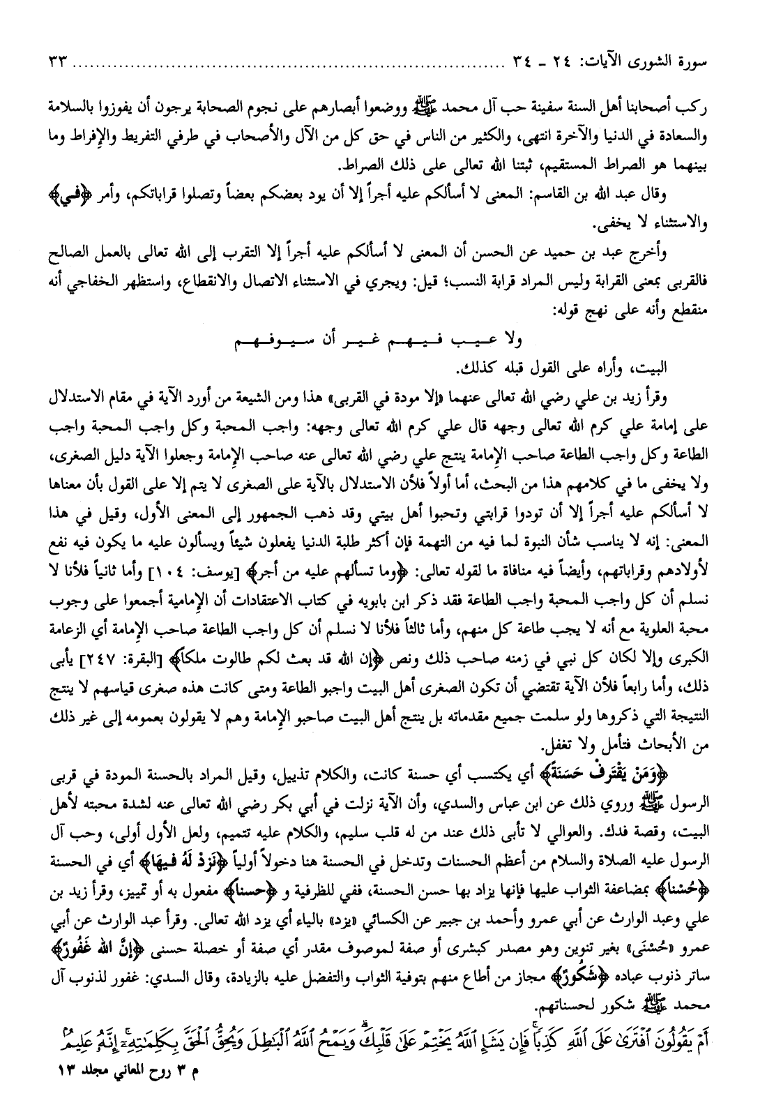 ينتج علي رضي الله تعالى عنه صاحب الإمامة وجعلوا الآية دليل الصغرى، ولا يخفى ما في كلامهم هذا من البحث، أما أولا فلأن الاستدلال بالآية على الصغرى لا يتم إلا على القول بأن معناها لا أسألكم عليه أجرا إلا أن تودوا قرابتي وتحبوا أهل بيتي وقد ذهب الجمهور إلى المعنى الأول، وقيل في هذا المعنى: إنه لا يناسب شأن النبوة لما فيه من التهمة فإن أكثر طلبة الدنيا يفعلون شيئا ويسألون عليه ما يكون فيه نفع لأولادهم وقراباتهم، وأيضا فيه منافاة ما لقوله تعالى: وَما تَسْئَلُهُمْ عَلَيْهِ مِنْ أَجْرٍ [يوسف: 104] وأما ثانيا فلأنا لا نسلم أن كل واجب المحبة واجب الطاعة فقد ذكر ابن بابويه في كتاب الاعتقادات أن الإمامية أجمعوا على وجوب محبة العلوية مع أنه لا يجب طاعة كل منهم، وأما ثالثا فلأنا لا نسلم أن كل واجب الطاعة صاحب الإمامة أي الزعامة الكبرى وإلا لكان كل نبي في زمنه صاحب ذلك ونص إِنَّ اللَّهَ قَدْ بَعَثَ لَكُمْ طالُوتَ مَلِكاً [البقرة: 247] يأبى ذلك، وأما رابعا فلأن الآية تقتضي أن تكون الصغرى أهل البيت واجبو الطاعة ومتى كانت هذه صغرى قياسهم لا ينتج النتيجة التي ذكروها ولو سلمت جميع مقدماته بل ينتج أهل البيت صاحبو الإمامة وهم لا يقولون بعمومه إلى غير ذلك من الأبحاث فتأمل ولا تغفل.