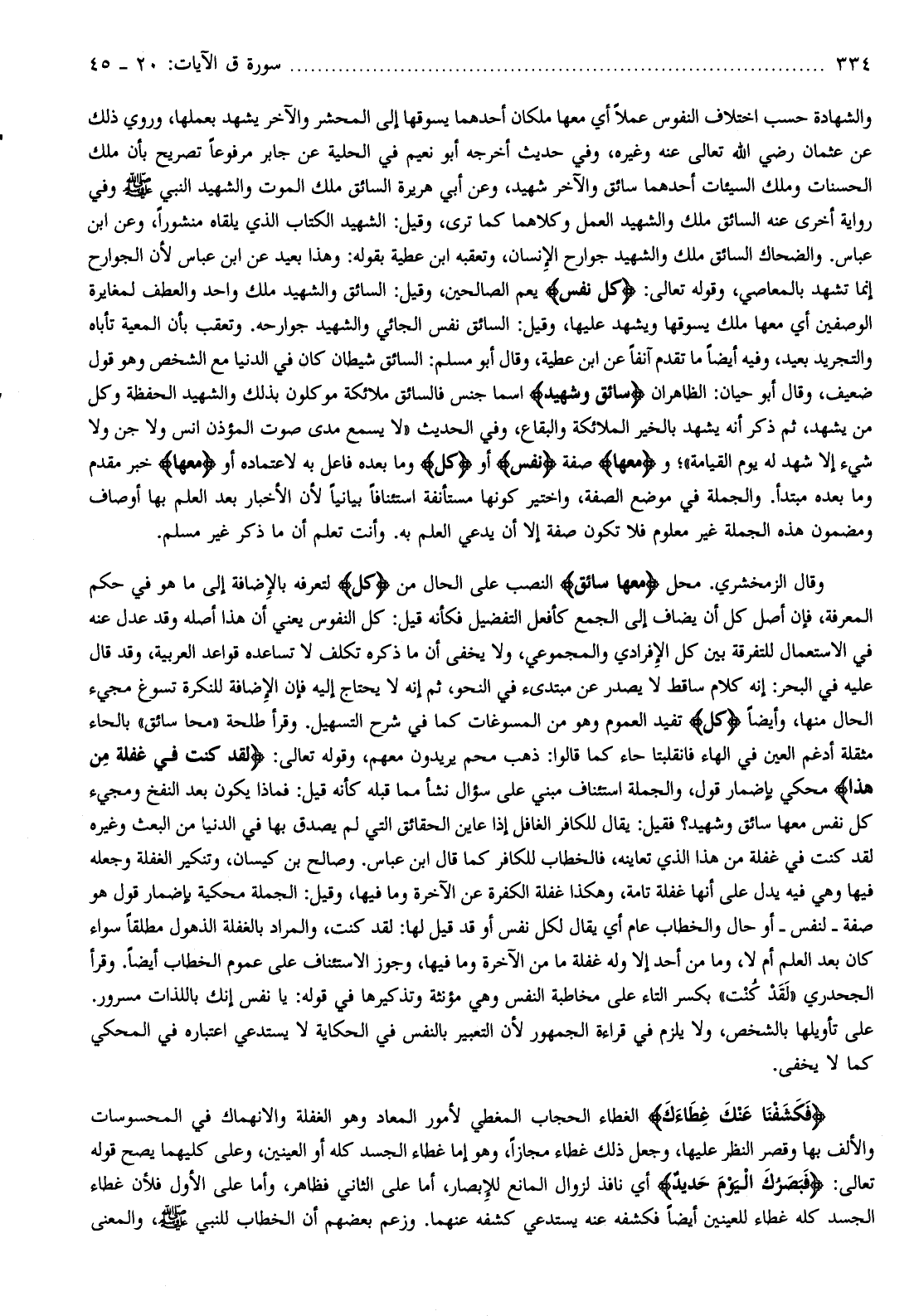 وقال الزمخشري. محل مَعَها سائِقٌ النصب على الحال من كُلُّ لتعرفه بالإضافة إلى ما هو في حكم المعرفة، فإن أصل كل أن يضاف إلى الجمع كأفعل التفضيل فكأنه قيل: كل النفوس يعني أن هذا أصله وقد عدل عنه في الاستعمال للتفرقة بين كل الإفرادي والمجموعي، ولا يخفى أن ما ذكره تكلف لا تساعده قواعد العربية، وقد قال عليه في البحر: إنه كلام ساقط لا يصدر عن مبتدىء في النحو، ثم إنه لا يحتاج إليه فإن الإضافة للنكرة تسوغ مجيء الحال منها، وأيضا كُلُّ تفيد العموم وهو من المسوغات كما في شرح التسهيل. وقرأ طلحة «محا سائق» بالحاء مثقلة أدغم العين في الهاء فانقلبتا حاء كما قالوا: ذهب محم يريدون معهم، وقوله تعالى: لَقَدْ كُنْتَ فِي غَفْلَةٍ مِنْ هذا محكي بإضمار قول، والجملة استئناف مبني على سؤال نشأ مما قبله كأنه قيل: فماذا يكون بعد النفخ ومجيء كل نفس معها سائق وشهيد؟ فقيل: يقال للكافر الغافل إذا عاين الحقائق التي لم يصدق بها في الدنيا من البعث وغيره لقد كنت في غفلة من هذا الذي تعاينه، فالخطاب للكافر كما قال ابن عباس. وصالح بن كيسان، وتنكير الغفلة وجعله فيها وهي فيه يدل على أنها غفلة تامة، وهكذا غفلة الكفرة عن الآخرة وما فيها، وقيل: الجملة محكية بإضمار قول هو صفة- لنفس- أو حال والخطاب عام أي يقال لكل نفس أو قد قيل لها: لقد كنت، والمراد بالغفلة الذهول مطلقا سواء كان بعد العلم أم لا، وما من أحد إلا وله غفلة ما من الآخرة وما فيها، وجوز الاستئناف على عموم الخطاب أيضا. وقرأ الجحدري «لقد كنت» بكسر التاء على مخاطبة النفس وهي مؤنثة وتذكيرها في قوله: يا نفس إنك باللذات مسرور.