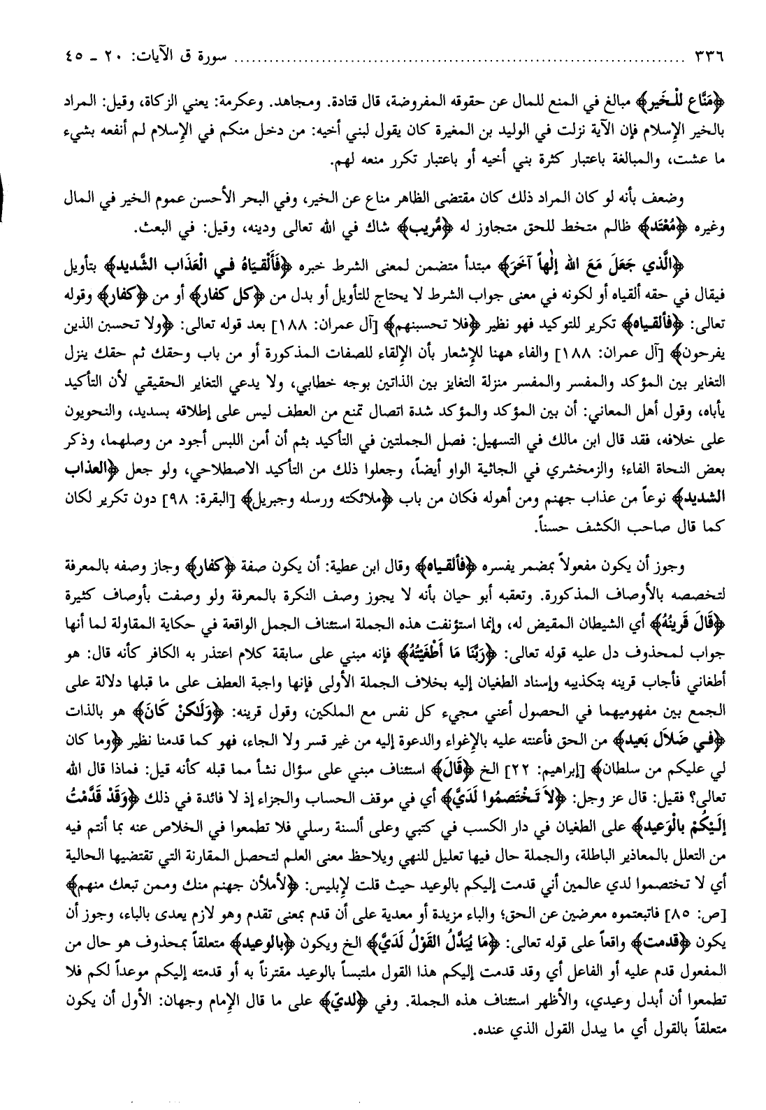 وجوز أن يكون مفعولا بمضمر يفسره فَأَلْقِياهُ وقال ابن عطية: أن يكون صفة كَفَّارٍ وجاز وصفه بالمعرفة لتخصصه بالأوصاف المذكورة. وتعقبه أبو حيان بأنه لا يجوز وصف النكرة بالمعرفة ولو وصفت بأوصاف كثيرة قالَ قَرِينُهُ أي الشيطان المقيض له، وإنما استؤنفت هذه الجملة استئناف الجمل الواقعة في حكاية المقاولة لما أنها جواب لمحذوف دل عليه قوله تعالى: رَبَّنا ما أَطْغَيْتُهُ فإنه مبني على سابقة كلام اعتذر به الكافر كأنه قال: هو أطغاني فأجاب قرينه بتكذيبه وإسناد الطغيان إليه بخلاف الجملة الأولى فإنها واجبة العطف على ما قبلها دلالة على الجمع بين مفهوميهما في الحصول أعني مجيء كل نفس مع الملكين، وقول قرينه: وَلكِنْ كانَ هو بالذات فِي ضَلالٍ بَعِيدٍ من الحق فأعنته عليه بالإغواء والدعوة إليه من غير قسر ولا الجاء، فهو كما قدمنا نظير وَما كانَ لِي عَلَيْكُمْ مِنْ سُلْطانٍ [إبراهيم: 22] إلخ قالَ استئناف مبني على سؤال نشأ مما قبله كأنه قيل: فماذا قال الله تعالى؟ فقيل: قال عز وجل: لا تَخْتَصِمُوا لَدَيَّ أي في موقف الحساب والجزاء إذ لا فائدة في ذلك وَقَدْ قَدَّمْتُ إِلَيْكُمْ بِالْوَعِيدِ على الطغيان في دار الكسب في كتبي وعلى ألسنة رسلي فلا تطمعوا في الخلاص عنه بما أنتم فيه من التعلل بالمعاذير الباطلة، والجملة حال فيها تعليل للنهي ويلاحظ معنى العلم لتحصل المقارنة التي تقتضيها الحالية أي لا تختصموا لدي عالمين أني قدمت إليكم بالوعيد حيث قلت لإبليس: لَأَمْلَأَنَّ جَهَنَّمَ مِنْكَ وَمِمَّنْ تَبِعَكَ مِنْهُمْ [ص: 85] فاتبعتموه معرضين عن الحق والباء مزيدة أو معدية على أن قدم بمعنى تقدم وهو لازم يعدى بالباء، وجوز أن يكون قَدَّمْتُ واقعا على قوله تعالى: ما يُبَدَّلُ الْقَوْلُ لَدَيَّ إلخ ويكون بِالْوَعِيدِ متعلقا بمحذوف هو حال من المفعول قدم عليه أو الفاعل أي وقد قدمت إليكم هذا القول ملتبسا بالوعيد مقترنا به أو قدمته إليكم موعدا لكم فلا تطمعوا أن أبدل وعيدي، والأظهر استئناف هذه الجملة. وفي لَدَيَّ على ما قال الإمام وجهان: الأول أن يكون متعلقا بالقول أي ما يبدل القول الذي عنده.