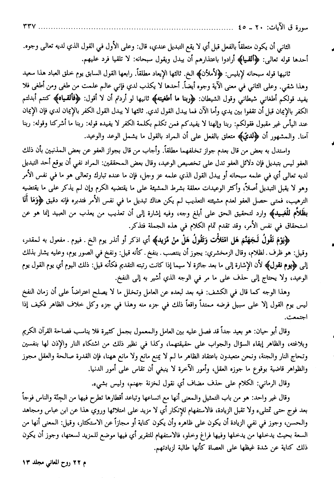 يَوْمَ نَقُولُ لِجَهَنَّمَ هَلِ امْتَلَأْتِ وَتَقُولُ هَلْ مِنْ مَزِيدٍ أي اذكر أو أنذر يوم إلخ. فيوم. مفعول به لمقدر، وقيل: هو ظرف. لظلام، وقال الزمخشري: يجوز أن ينتصب. بنفخ. كأنه قيل: ونفخ في الصور يوم، وعليه يشار بذلك إلى يَوْمَ نَقُولُ لأن الإشارة إلى ما بعد جائزة لا سيما إذا كانت رتبته التقديم فكأنه قيل: ذلك اليوم أي يوم القول يوم الوعيد، ولا يحتاج إلى حذف على ما مر في الوجه الذي أشير به إلى النفخ.