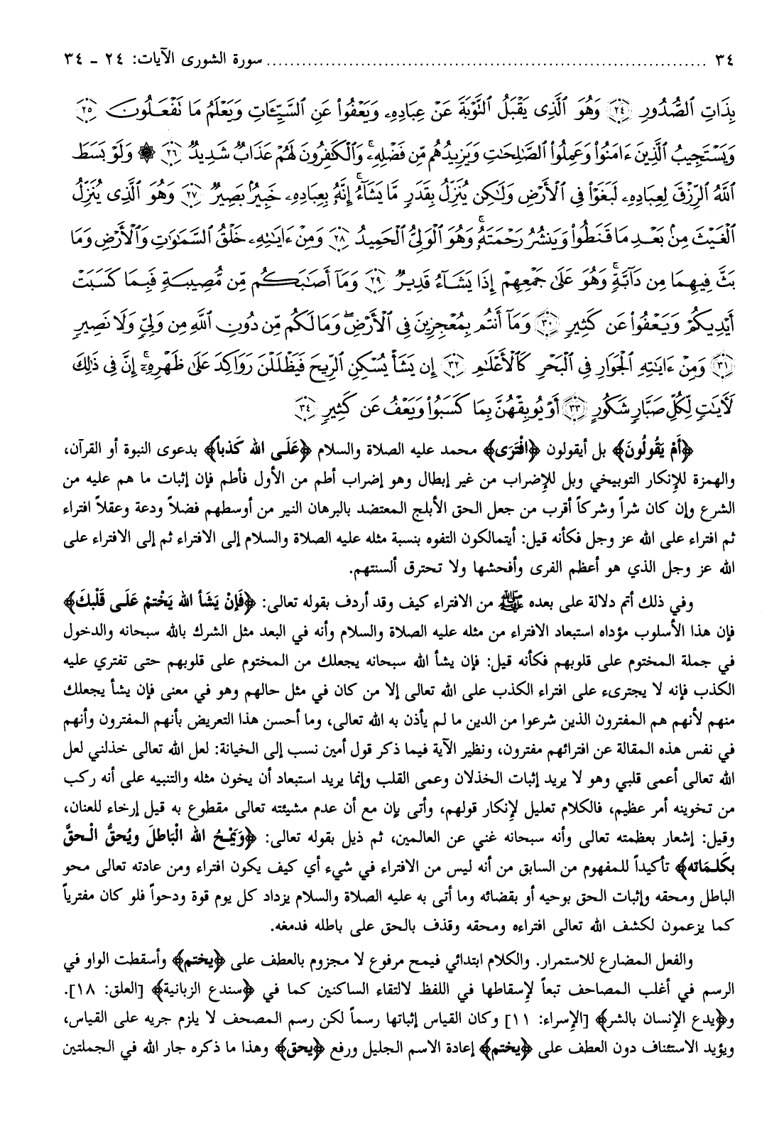 وفي ذلك أتم دلالة على بعده صلّى الله عليه وسلّم من الافتراء كيف وقد أردف بقوله تعالى: فَإِنْ يَشَإِ اللَّهُ يَخْتِمْ عَلى قَلْبِكَ فإن هذا الأسلوب مؤداه استبعاد الافتراء من مثله عليه الصلاة والسلام وأنه في البعد مثل الشرك بالله سبحانه والدخول في جملة المختوم على قلوبهم فكأنه قيل: فإن يشأ الله سبحانه يجعلك من المختوم على قلوبهم حتى تفتري عليه الكذب فإنه لا يجترىء على افتراء الكذب على الله تعالى إلا من كان في مثل حالهم وهو في معنى فإن يشأ يجعلك منهم لأنهم هم المفترون الذين شرعوا من الدين ما لم يأذن به الله تعالى، وما أحسن هذا التعريض بأنهم المفترون وأنهم في نفس هذه المقالة عن افترائهم مفترون، ونظير الآية فيما ذكر قول أمين نسب إلى الخيانة: لعل الله تعالى خذلني لعل الله تعالى أعمى قلبي وهو لا يريد إثبات الخذلان وعمى القلب وإنما يريد استبعاد أن يخون مثله والتنبيه على أنه ركب من تخوينه أمر عظيم، فالكلام تعليل لإنكار قولهم، وأتى بإن مع أن عدم مشيئته تعالى مقطوع به قيل إرخاء للعنان، وقيل: إشعار بعظمته تعالى وأنه سبحانه غني عن العالمين، ثم ذيل بقوله تعالى: وَيَمْحُ اللَّهُ الْباطِلَ وَيُحِقُّ الْحَقَّ بِكَلِماتِهِ تأكيدا للمفهوم من السابق من أنه ليس من الافتراء في شيء أي كيف يكون افتراء ومن عادته تعالى محو الباطل ومحقه وإثبات الحق بوحيه أو بقضائه وما أتى به عليه الصلاة والسلام يزداد كل يوم قوة ودحوا فلو كان مفتريا كما يزعمون لكشف الله تعالى افتراءه ومحقه وقذف بالحق على باطله فدمغه.